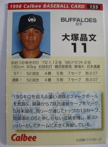 カルビープロ野球カード98年#155【大塚 晶文(近鉄バファローズ)Bu】平成10年1998年チップスおまけ食玩トレーディングカード【中古】送料込