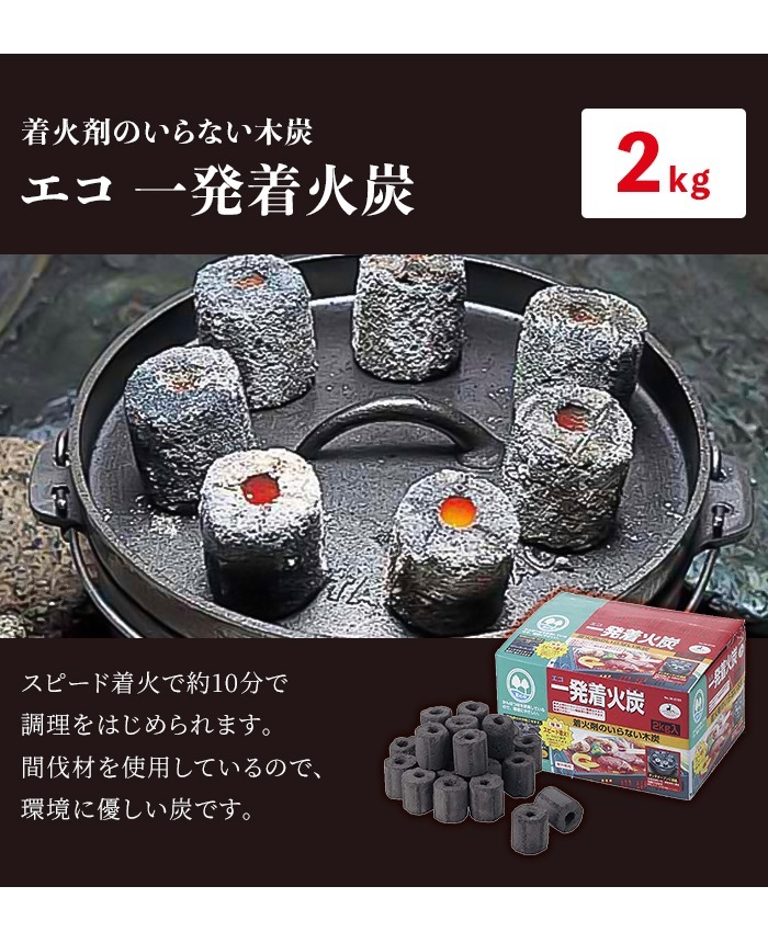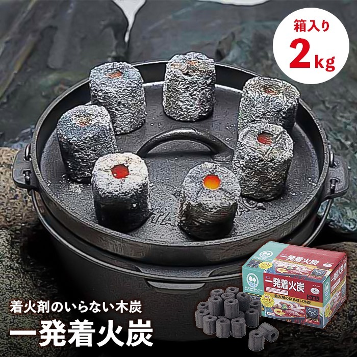 | 木炭に代わる次世代燃料!一発着火炭2kg入りです。 燃料としてだけでなく、着火材としても使用できます。 スピード簡単着火!約10分で調理が始められます。 (燃焼条件により異なります。) 着火した一発着火の上に備長炭を乗せ、30から40分放置すれば備長炭の火が起こせます。 大きさが均等で乗せやすく、熱も均等にしやすいです。 熱量の調節も木炭に比べ簡単なのでダッチオーブンに最適。 卓上用の小型バーベキューコンロに最適なサイズです。 |