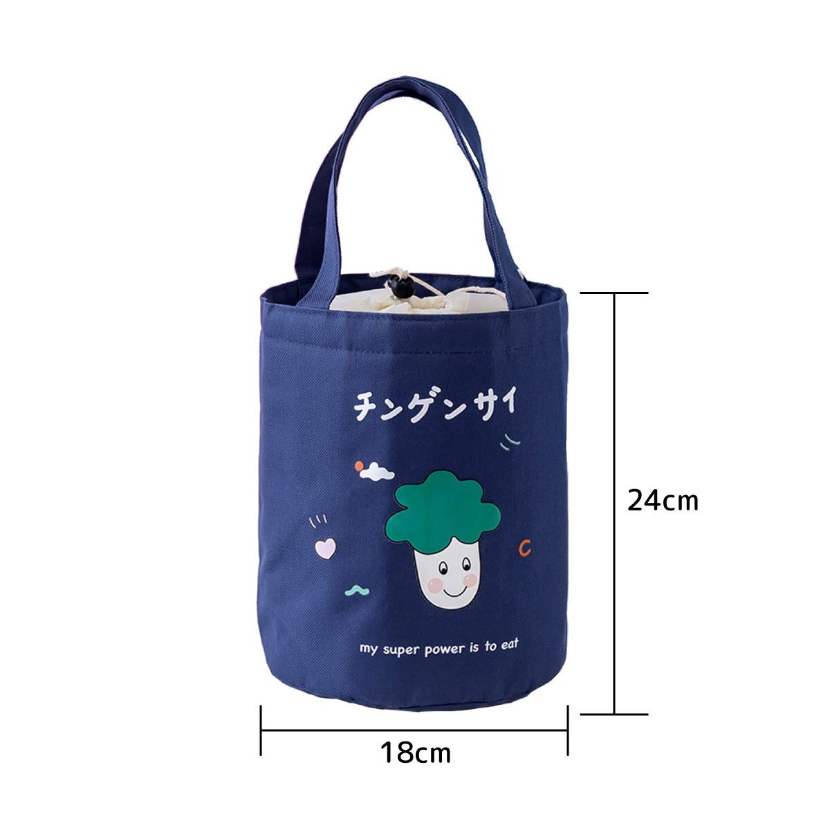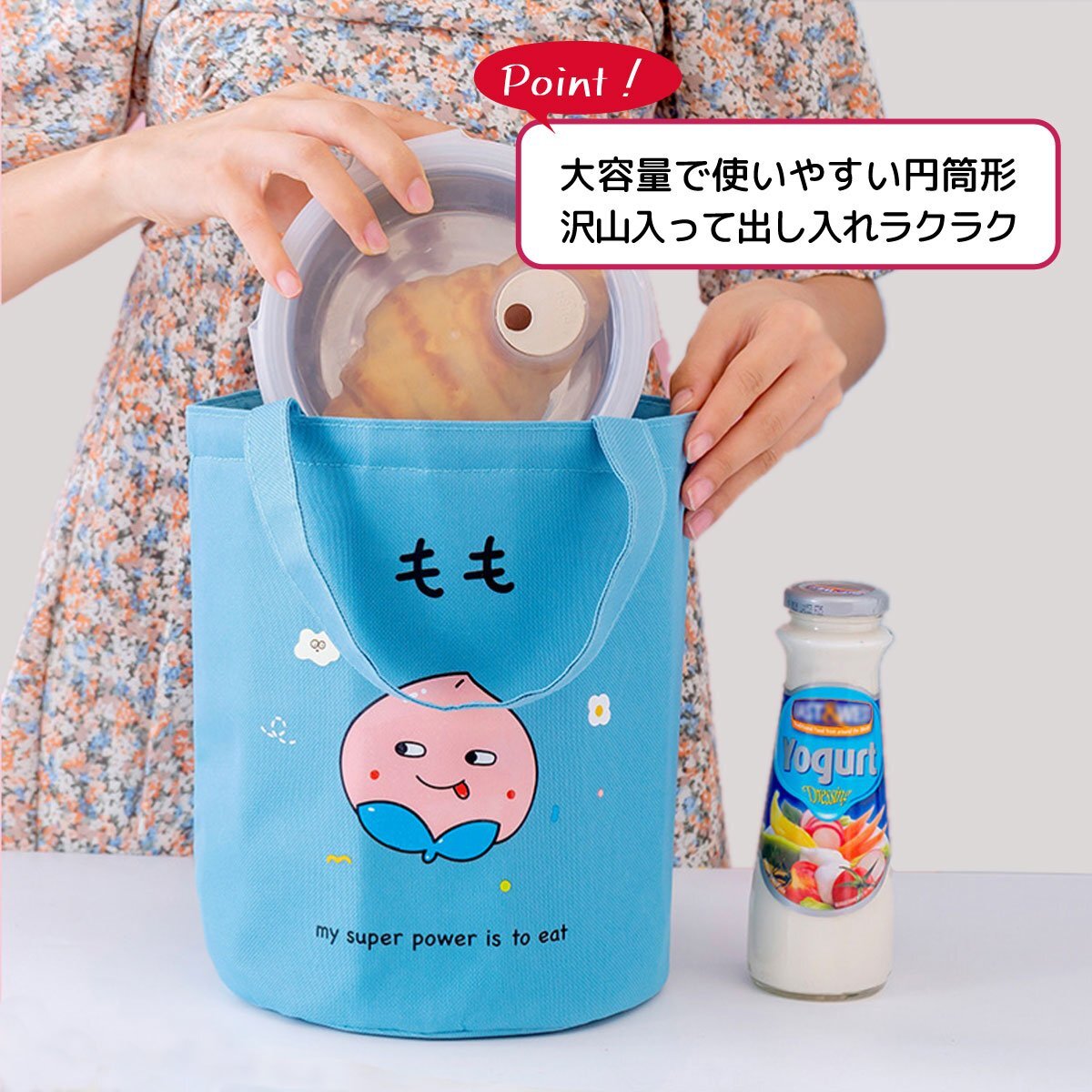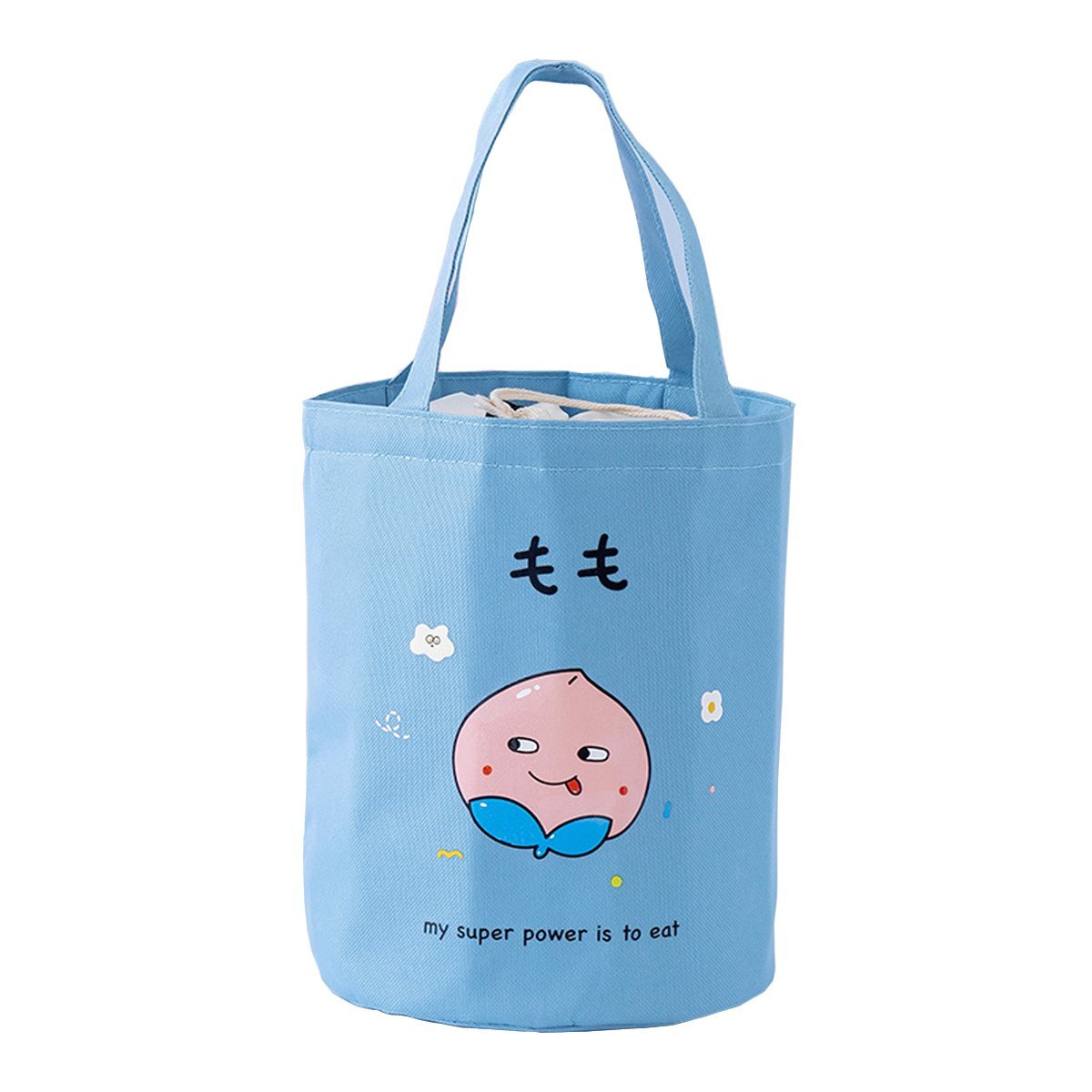 H10836【新品】【送料無料】ランチバッグ 保温 保冷 円筒型 ブルー もも 巾着 トートバッグ ランチトート サブバッグ お弁当 野菜柄バッグ