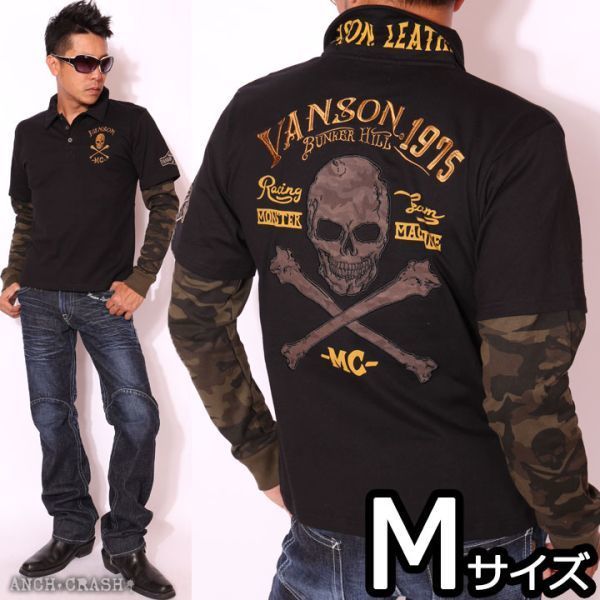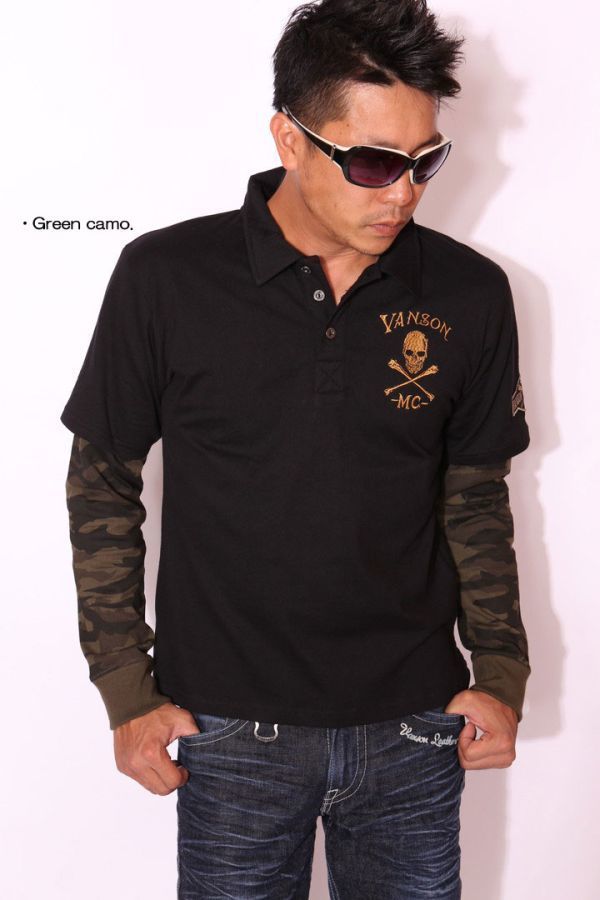当店別注 VANSON バンソン フェイクレイヤード 長袖 ポロシャツ ブラック×袖グリーンカモ【Mサイズ 】NVPS-519 バイカー アメカジ 刺繍