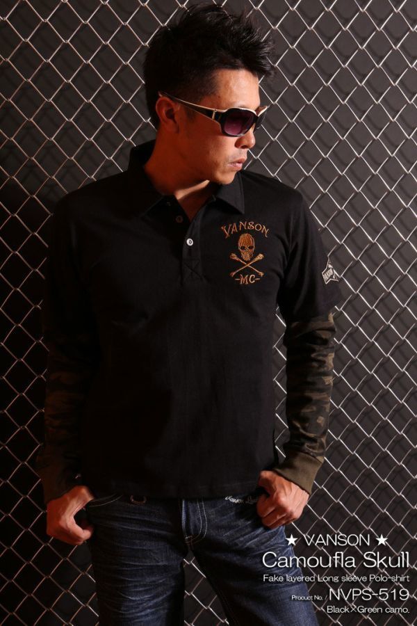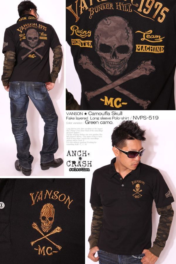 『アメリカが生んだ革の魔術師』高品質で世界中に愛される伝説のバイカーズブランド【VANSON(バンソン)】、カモフラ スカル 刺繍 フェイクレイヤード 長袖ポロ!