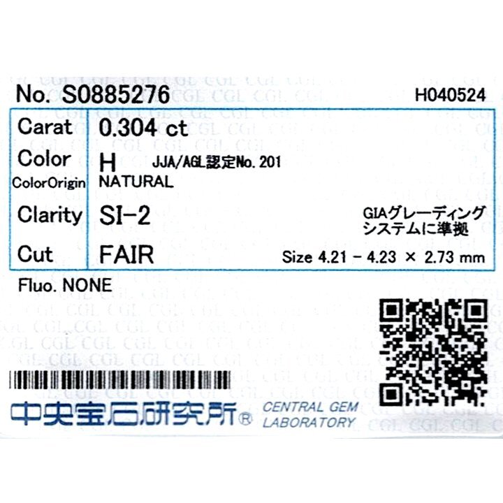 | 天然ダイヤモンドルース 0.304ct H/SI-2/FAIR ラウンドブリリアントカット 中央宝石研究所 ソーティング付き | ||||