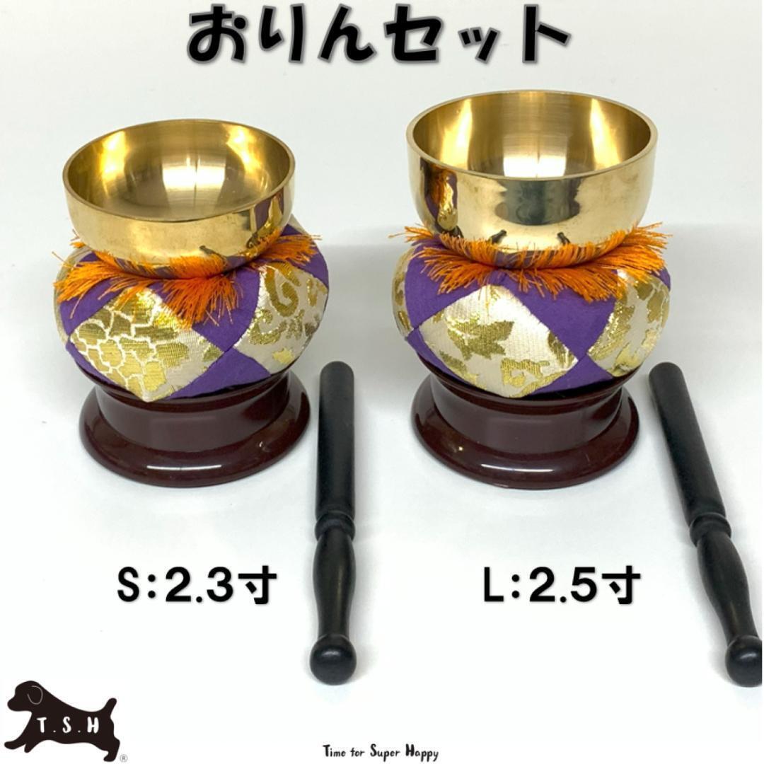 ☆おりんセットは りん、りん布団、りん台、りん棒の一式。綺麗な輝きのりんの音色は美しく響き渡ります。Sサイズのおりんは2.3寸、Lサイズのおりんは2.5寸です。