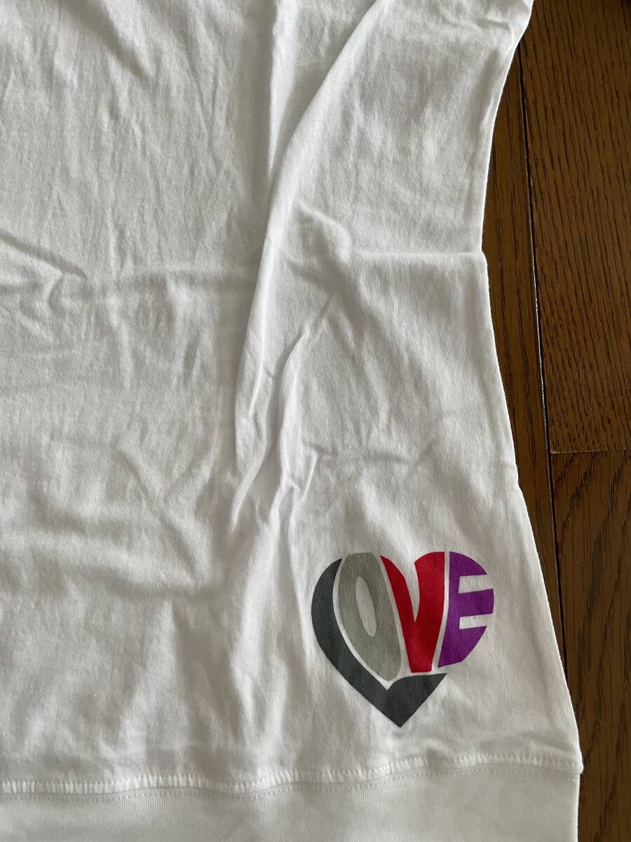 ・色は白です。袖丈は5分袖くらいかと思います。襟元〜胸元にかけて、結構深めのU型に開いています。前面の右胸、背面の右裾にロゴマーク等が描かれています。お腹の部分にポケットがあります。