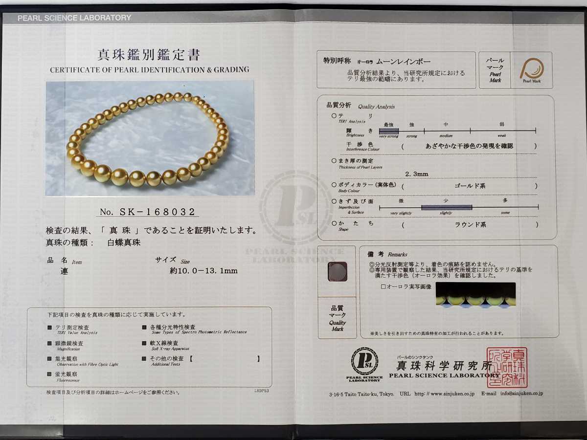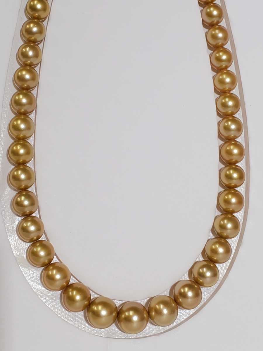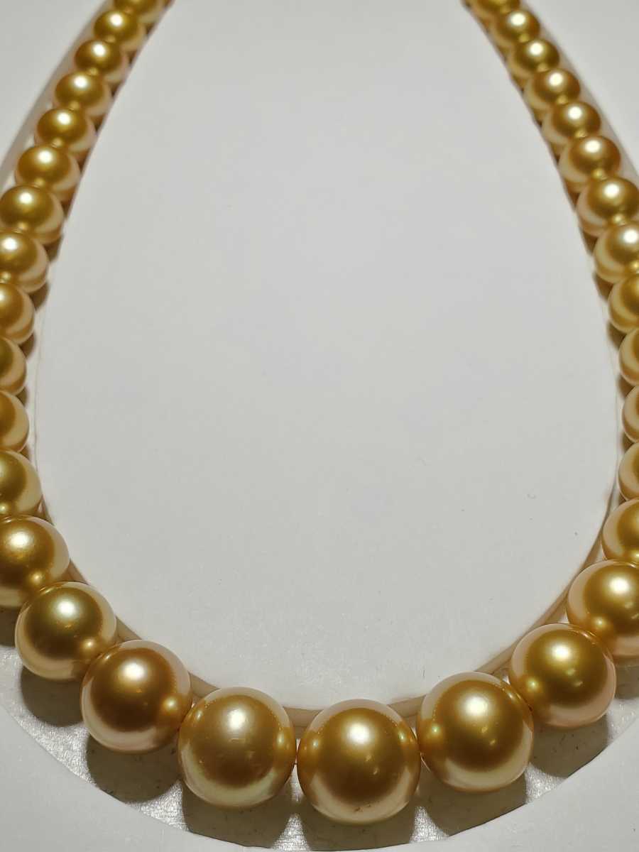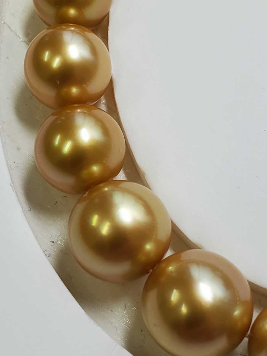 形はパーフェクトなラウンド珠を使用、全ピースをほぼリング珠品質のピースで組んだネックレスで、エクボや成長痕なども「極めて少ない」と言えるレベルです。