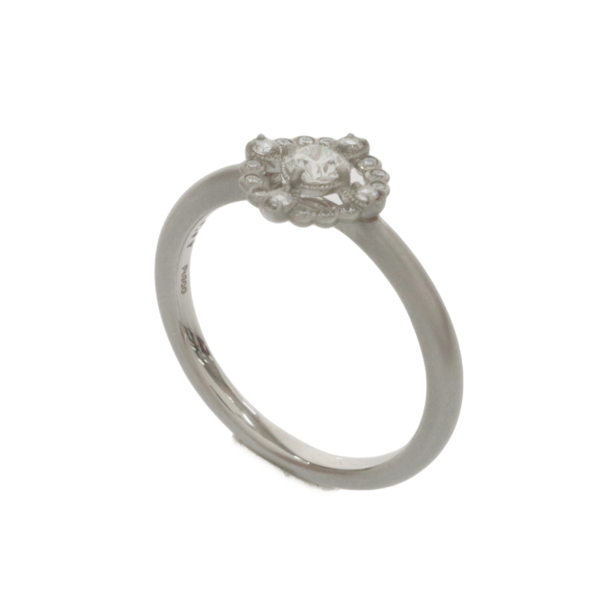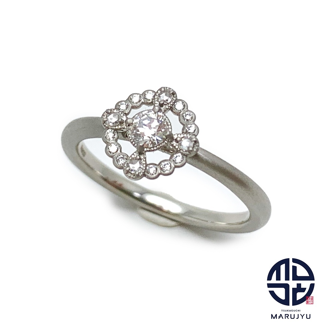 | サークル型にダイヤがセッティングされているリングになります。プラチナ部分が梨地加工されているので、マットな感じがござします。中石0.111ct(リングに刻印ございません)はカットも照りも抜群です!Aランク。新品仕上げ済みのお品になります。仕上げでは取り切れない小傷はご了承くださいませ。 | |