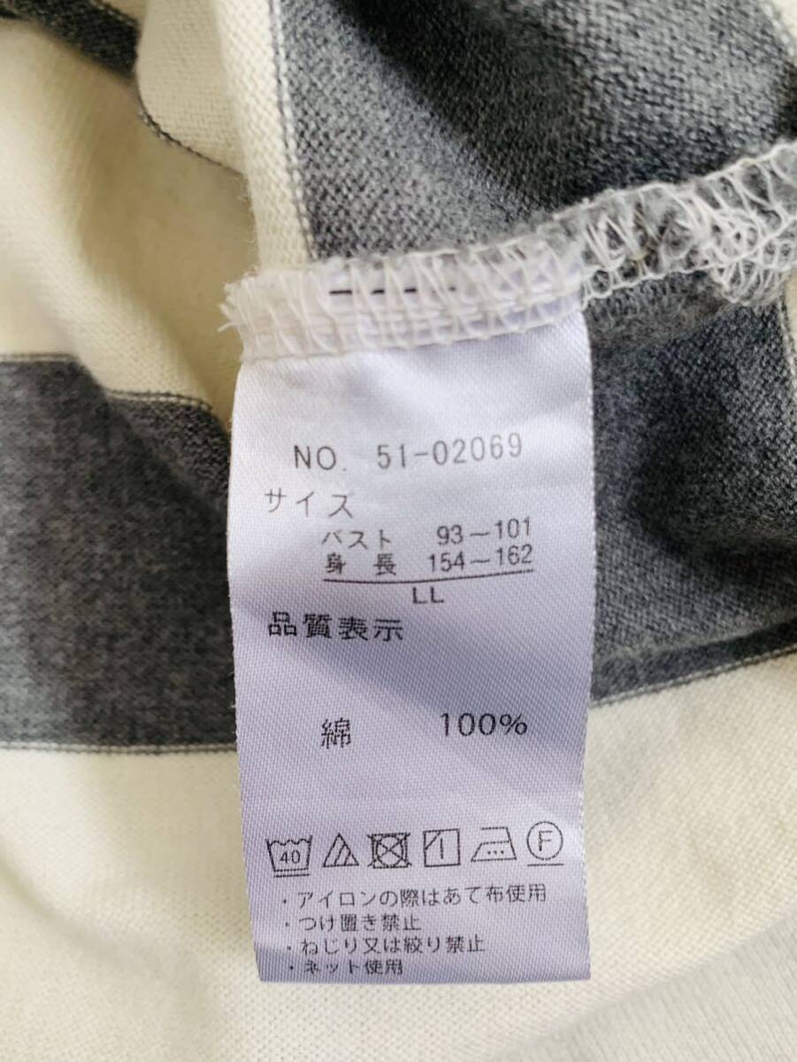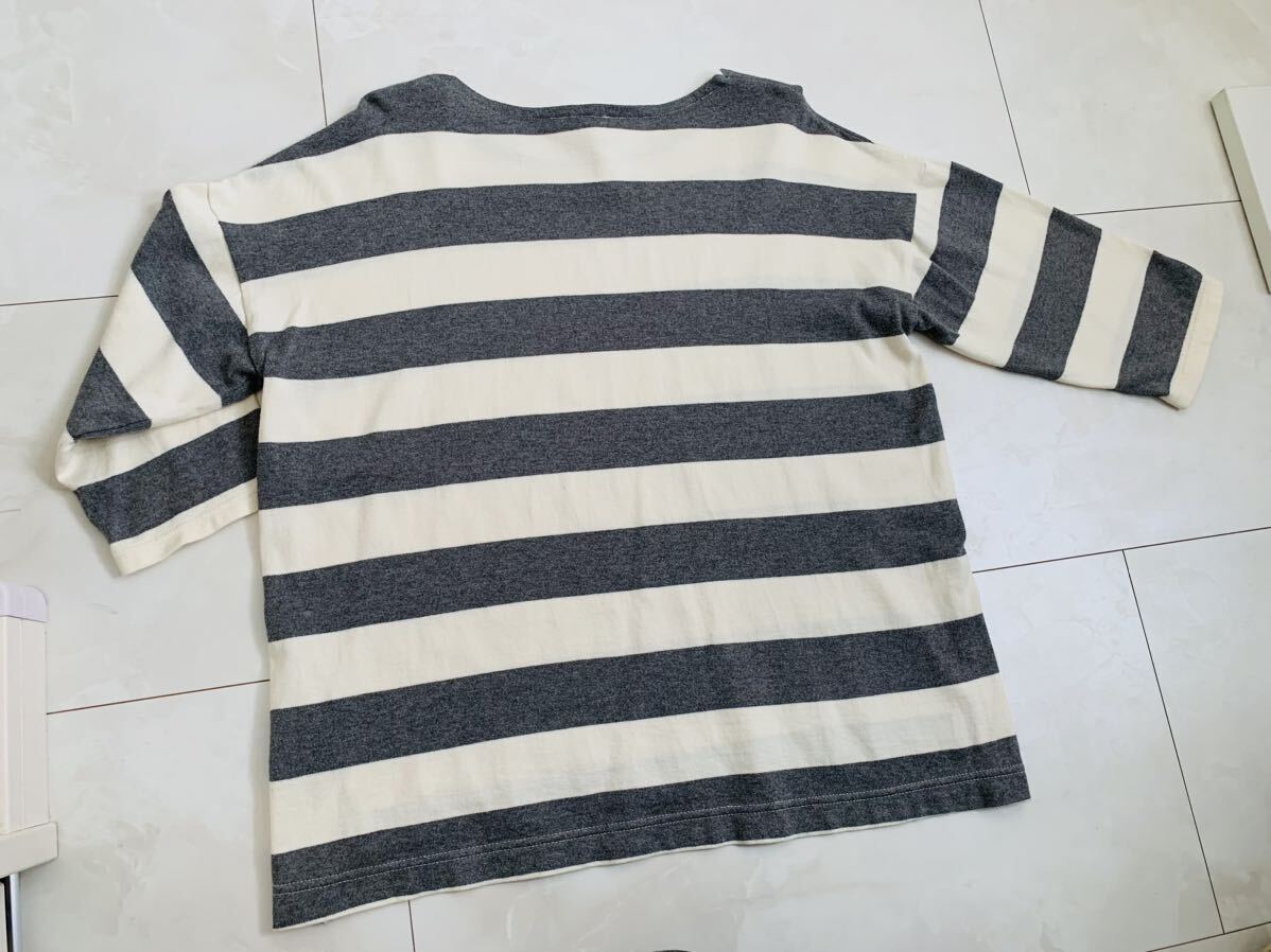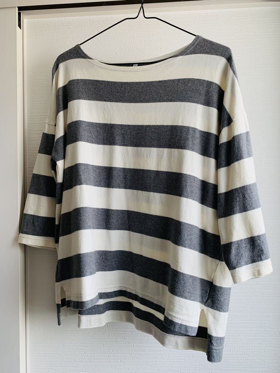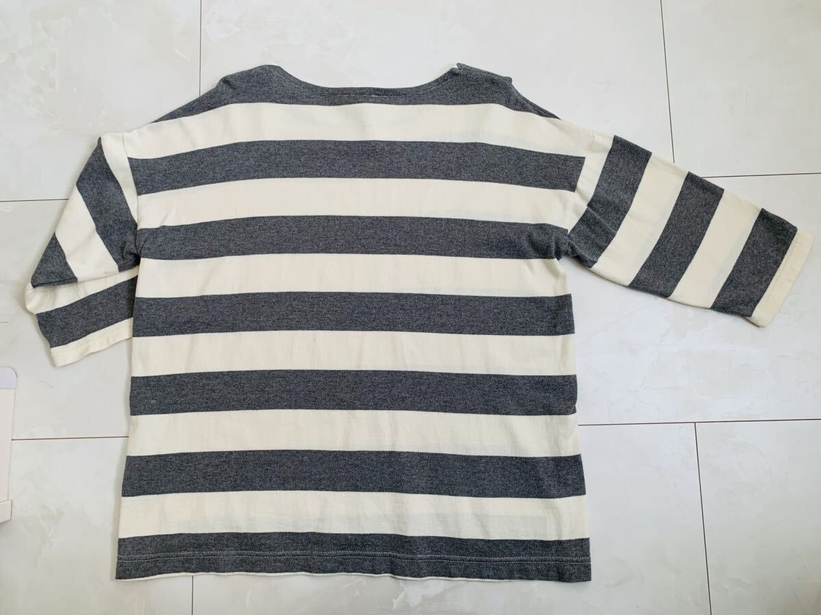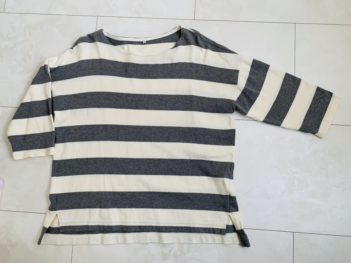 ★太いボーダー柄の七分?八分袖の長袖カットソーです。 後ろの丈が4cm長くておしゃれです。 色はグレー×オフホワイトです。 サイズはLLサイズです。 平置きサイズで、身幅約54cm・着丈約60cmです。 後ろの着丈は4cm長くて64cmです。 1~2回の使用ですのでキレイですが USD品の為、使用感や毛玉などがございます。 その為、新品・完璧を求められる方や神経質な方は 入札をお控え下さい。 | |||