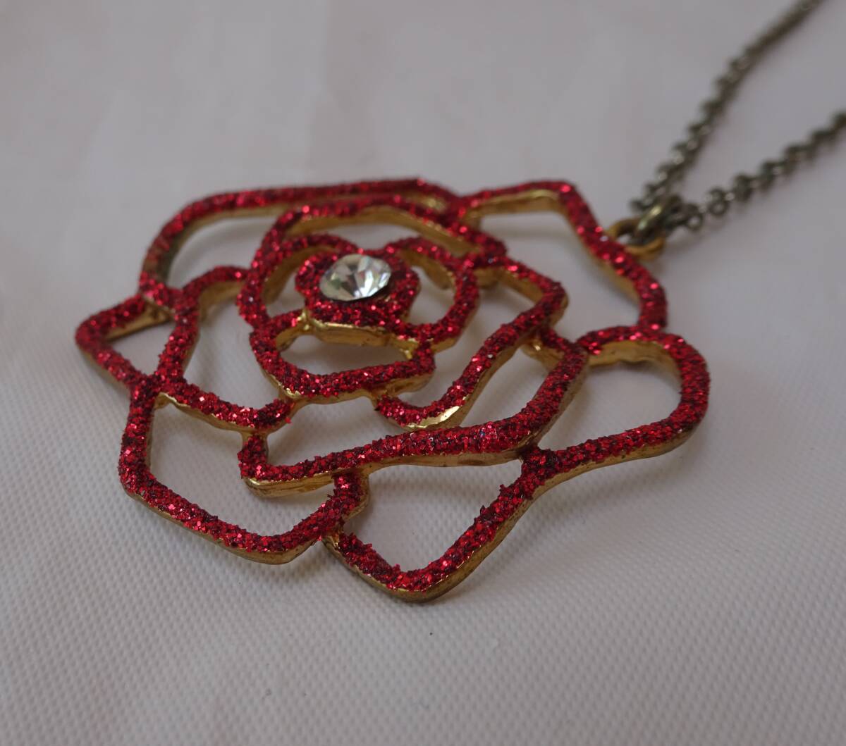 ネックレス バラ 赤 ラメ ストーン付き