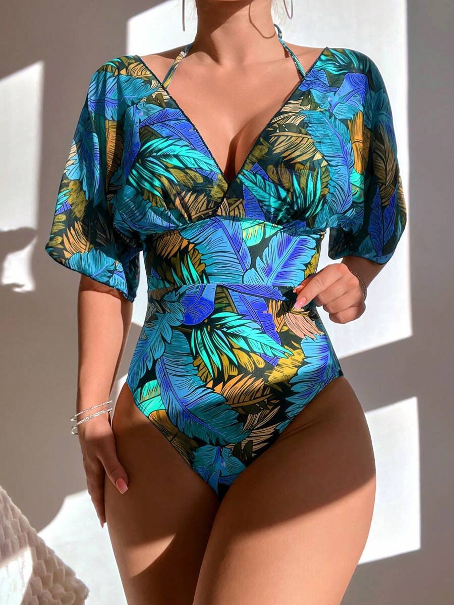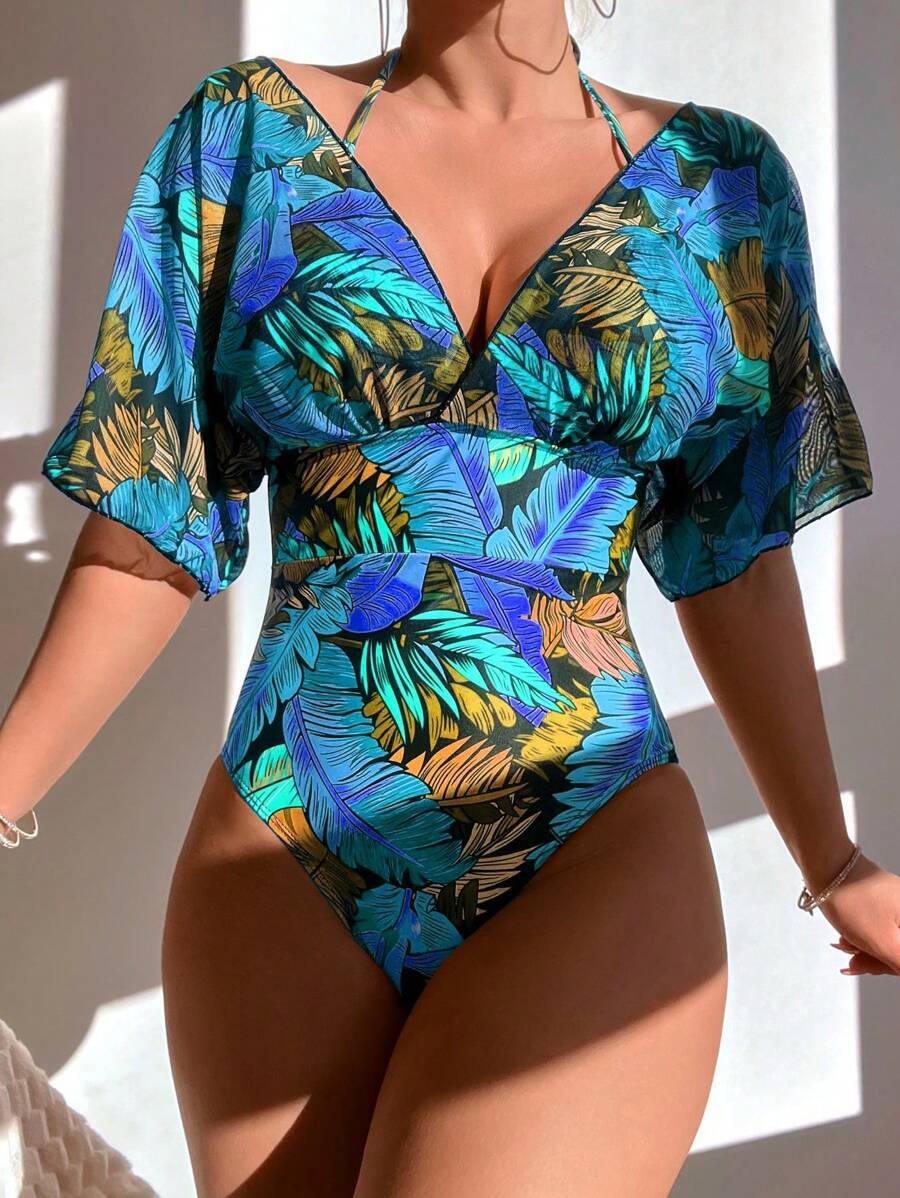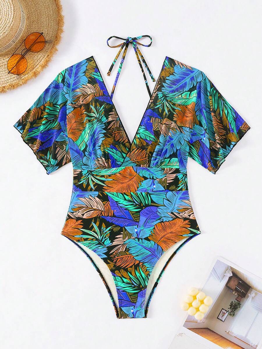 レディース 水着 ワンピース バケーションプリント ワンピース水着 女性用 短袖 夏ビーチ