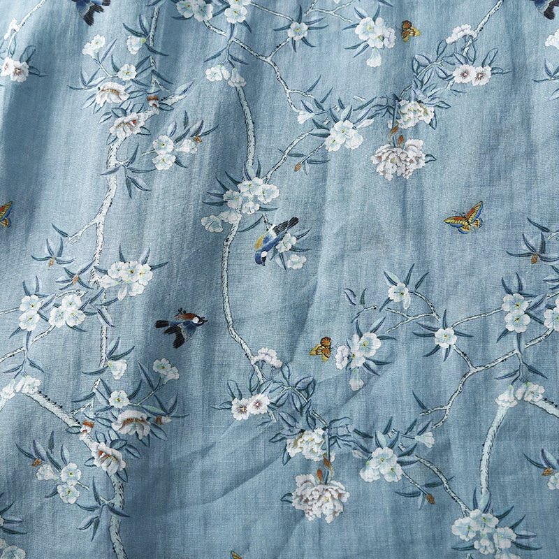 B0171☆大人 上品 エレガントな花柄プリント綿麻ワンピース レディース ワンピース 50代 60代 ファッション ブルー 薄手 夏のお出かけに
