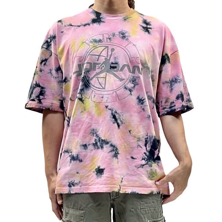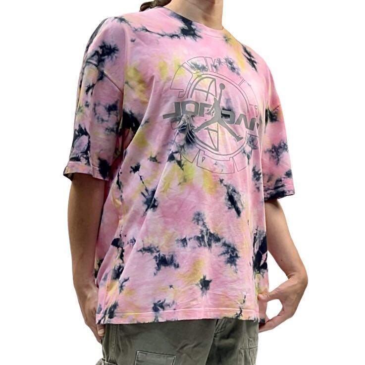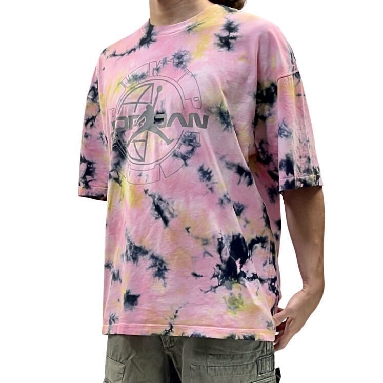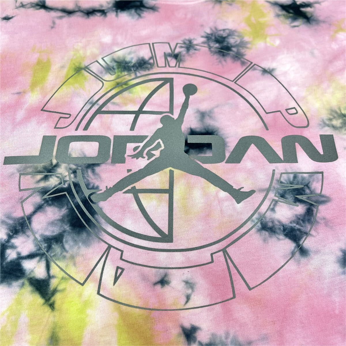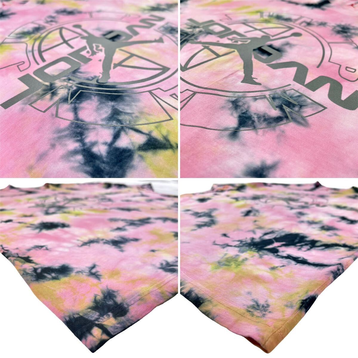 インパクトのあるピンクベースのタイダイ染めマルチカラーボディにしっくり馴染んだジャンプマンロゴはリフレクタープリントになっていて、光を当てる事によって反射して浮き出るカッコいいデザイン。