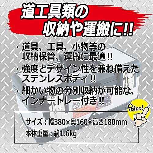 「SK11 ステンレス工具箱 幅380×奥160×高さ180mm F-SK001」▼4977292830805▼(商品説明)・ブラック F-SK001・用途:道具・工具・小物等の収納保管・運搬・サイズ(約):幅380×奥160×高さ180mm・重量:約1.6kg・最大積載量:(本体)約10kg・(インナートレー)約2kg・材質:SUS430説明 強度とデザイン性を兼ね備えたステンレスボディ。 小物収納時に便利なインナートレーつき。 サイズ(約):幅380×奥160×高さ180mm 重量:約1.6kg ※注意※ 本体を持ち上げる際にバックルが確実にロックされている事を確認下さい。 バックルのロックが不完全なまま持ち上げますと、破損・ケガの恐れがあり危険です。 精密機器等の収納時は、取扱に十分にご注意ください。 本来の目的、用途以外には使用しないで下さい。