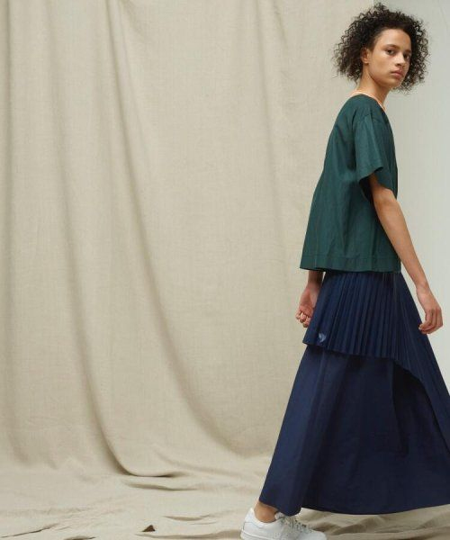 透けないポリエステル100%のタイプライター生地を使用し、フレア型、ロング丈、プリーツ、アシンメトリーデザイン、ウエストゴムベルトなど、細部まで凝ったデザインです。