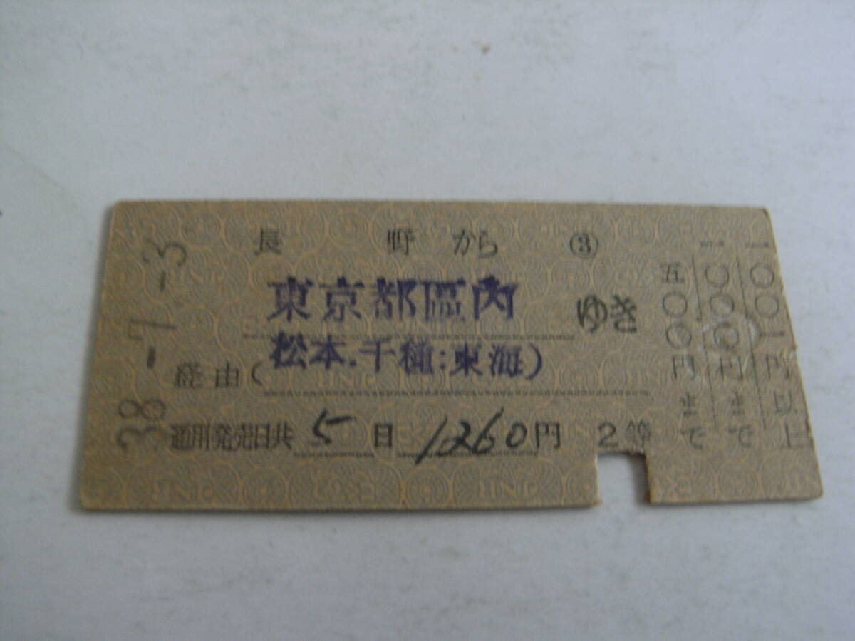 信越本線 長野から東京都区内ゆき 1260円 2等 昭和38年7月3日 長野駅発行 補充式硬券乗車券