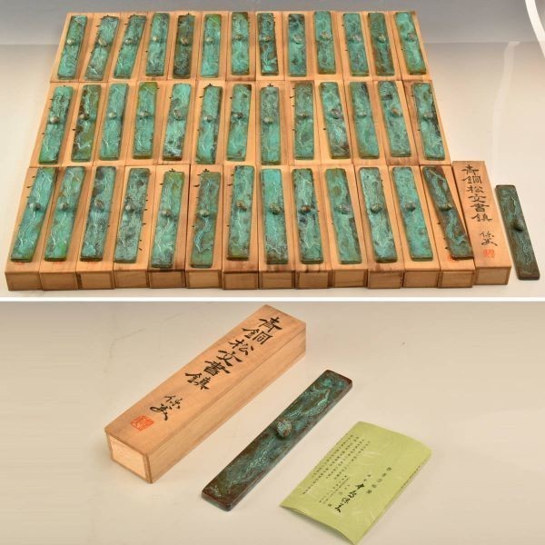 T11928 中島保美 青銅松文書鎮 40個:真作T11928(平均)高さ:1.9センチ 最大径:3センチ 口径:17.8センチ 状態:各大体良好。各底に同じ記念銘入っています。箱に傷みある物僅か。"