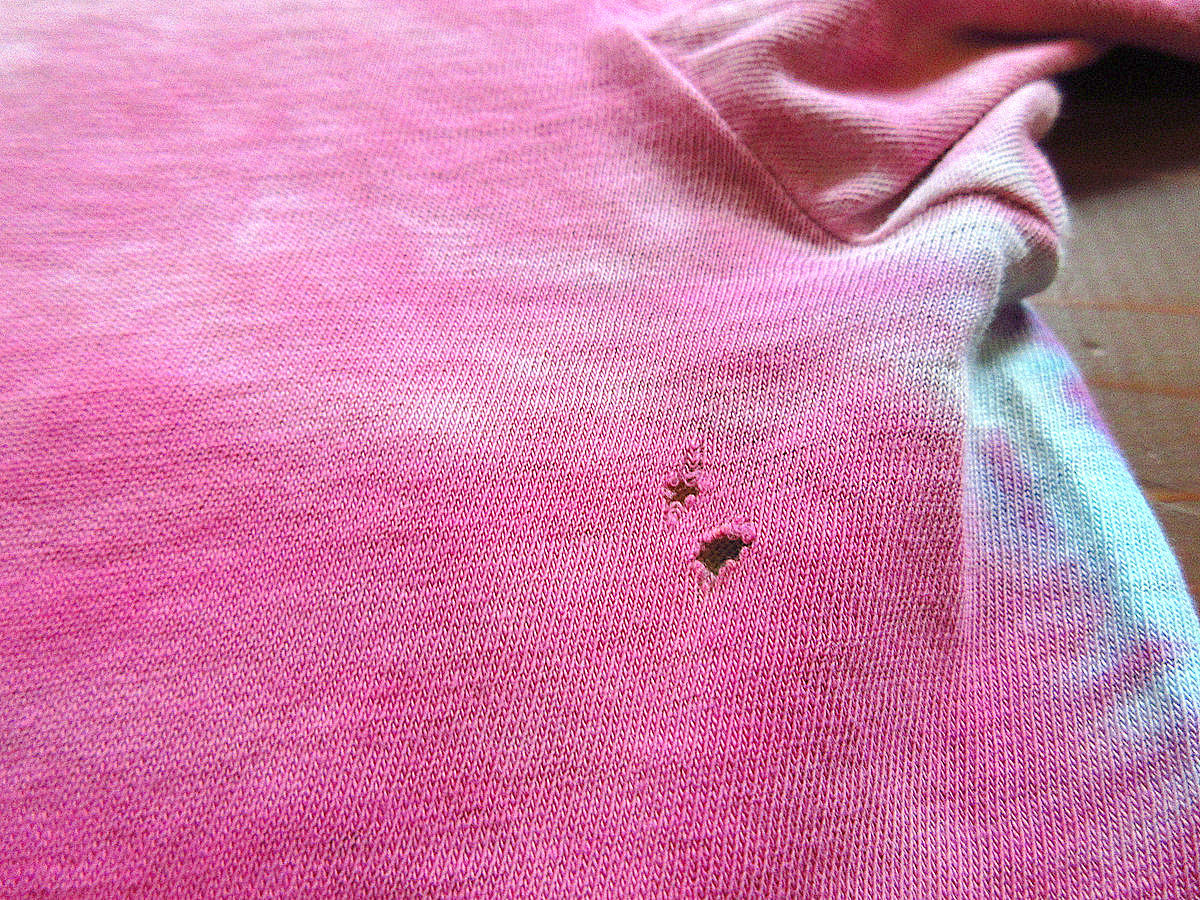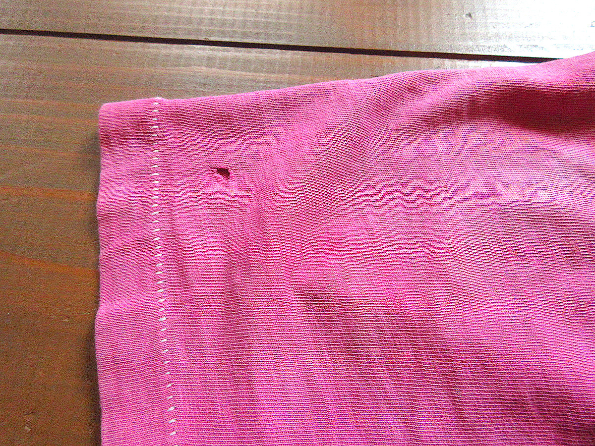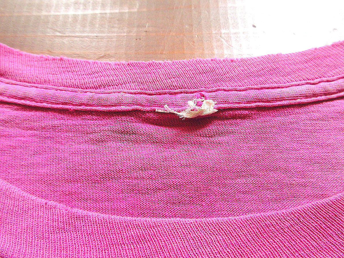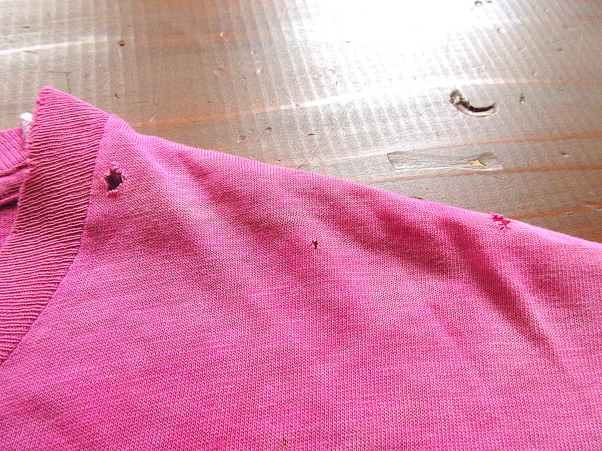 首リブにダメージあり、所々に小穴あり、タグ欠損、生地が薄くなっています。