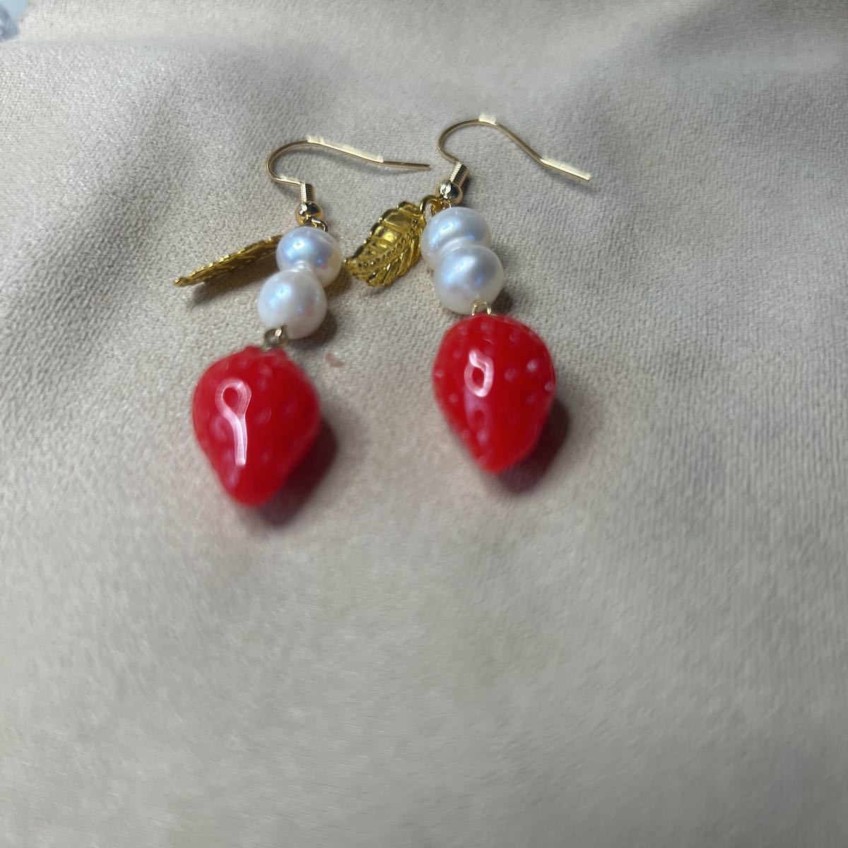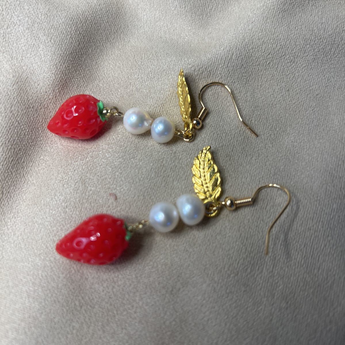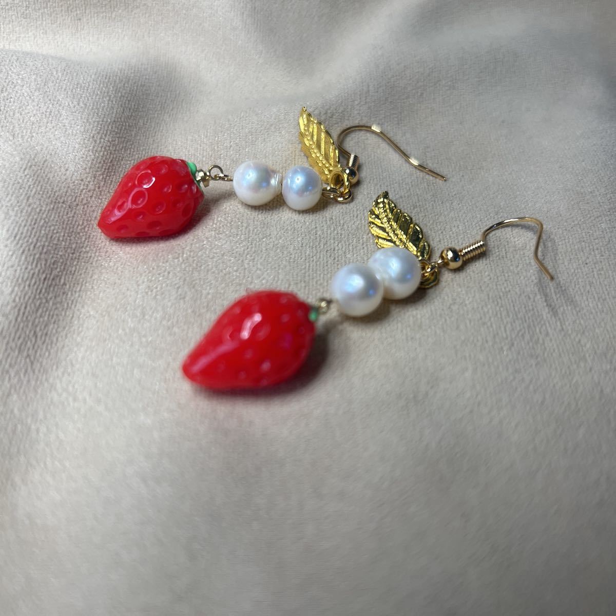 可愛い苺に淡水パールとリーフを付けてピアスにしました。フックはステンレスに金メッキしたものを使用しております。淡水パールは天然ですので傷凹みあります。