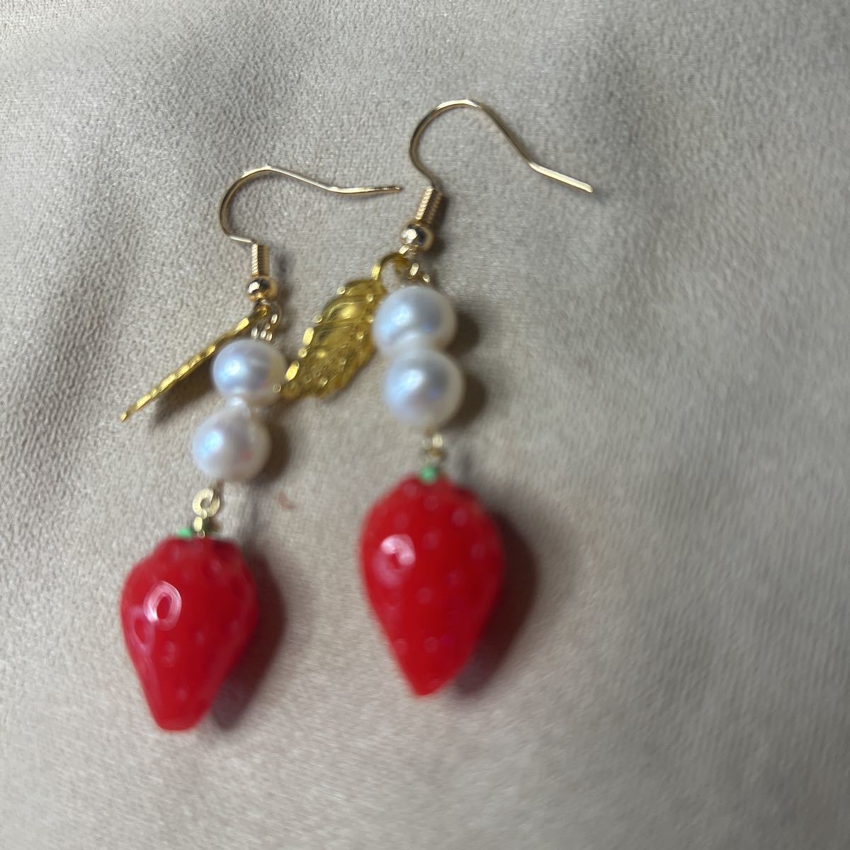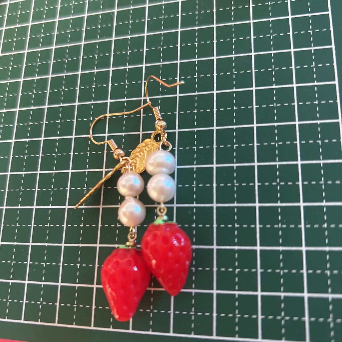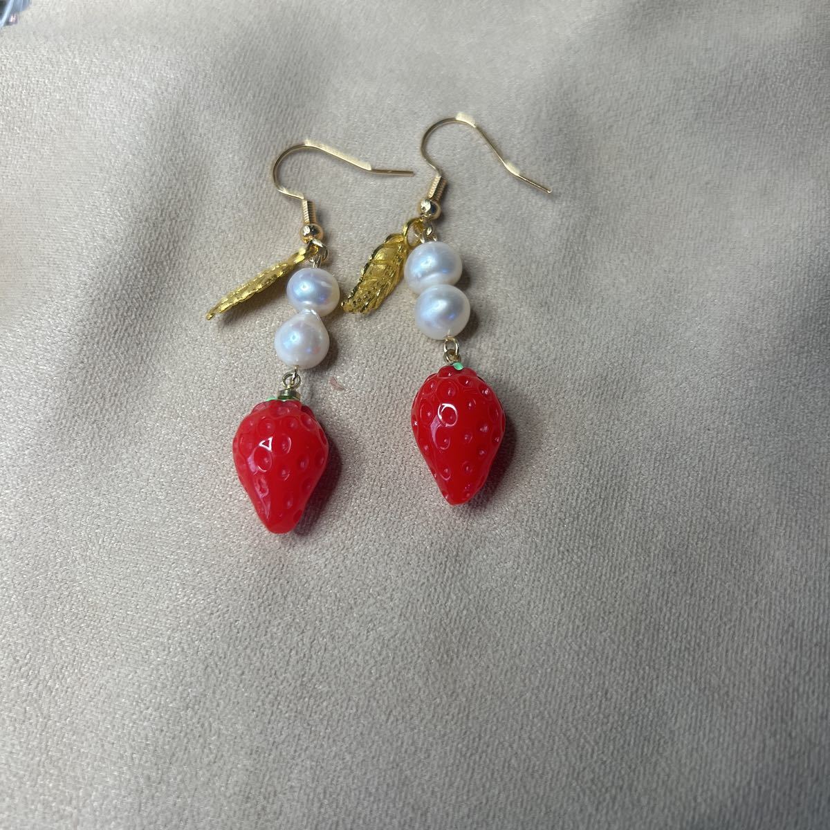 可愛い苺に淡水パールとリーフを付けてピアスにしました。フックはステンレスに金メッキしたものを使用しております。淡水パールは天然ですので傷凹みあります。