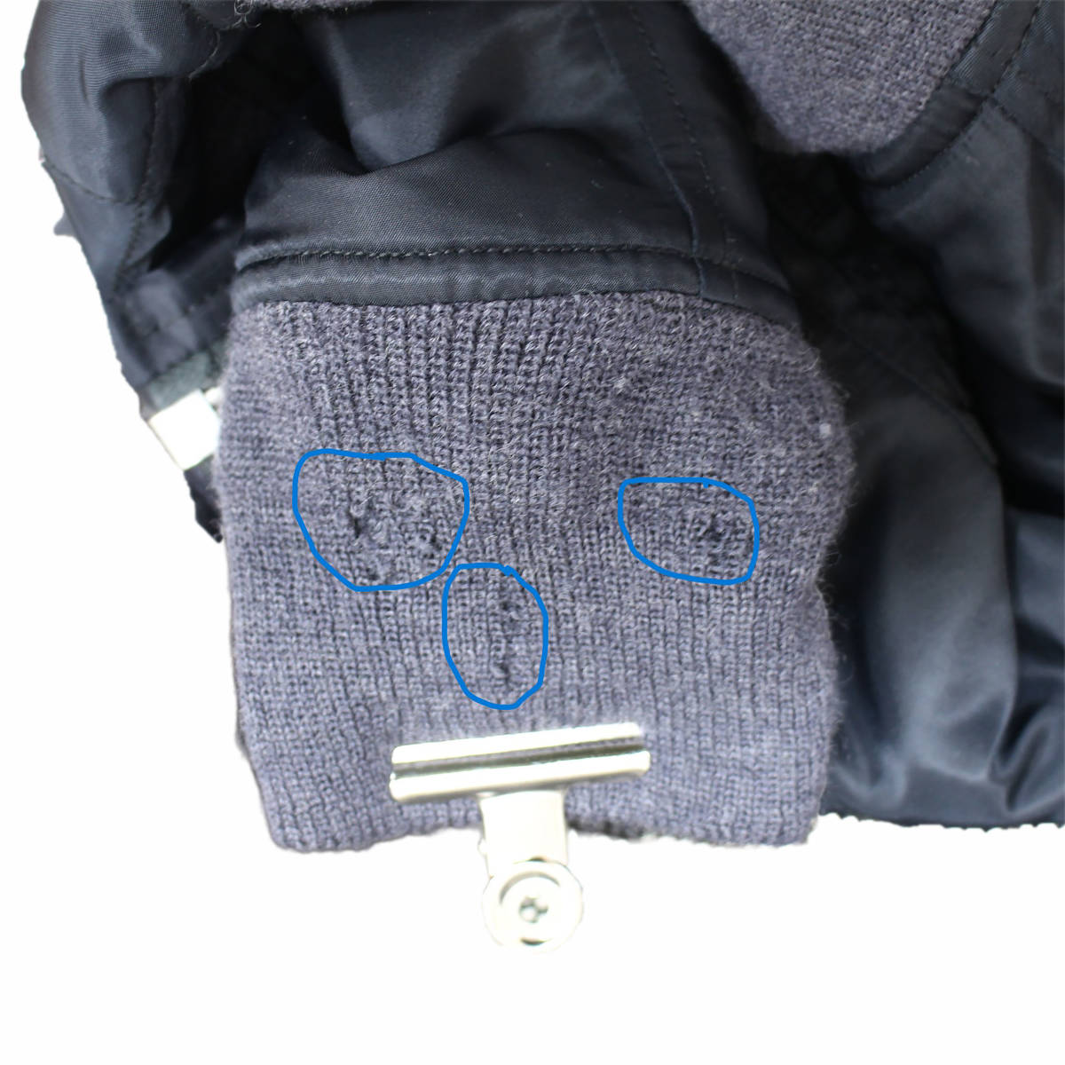 ・右袖のリブ部分に引っ掛けて生地が伸びたような跡があります。(画像6枚目参照)←穴は開いていません。