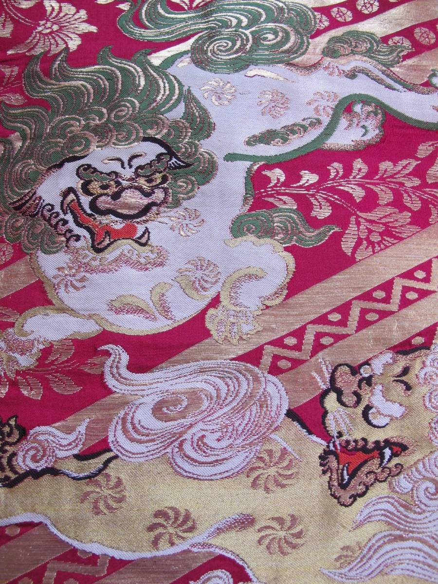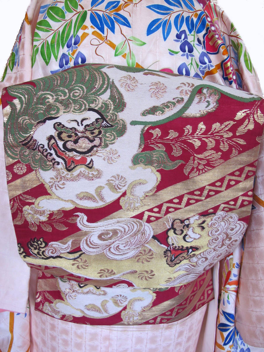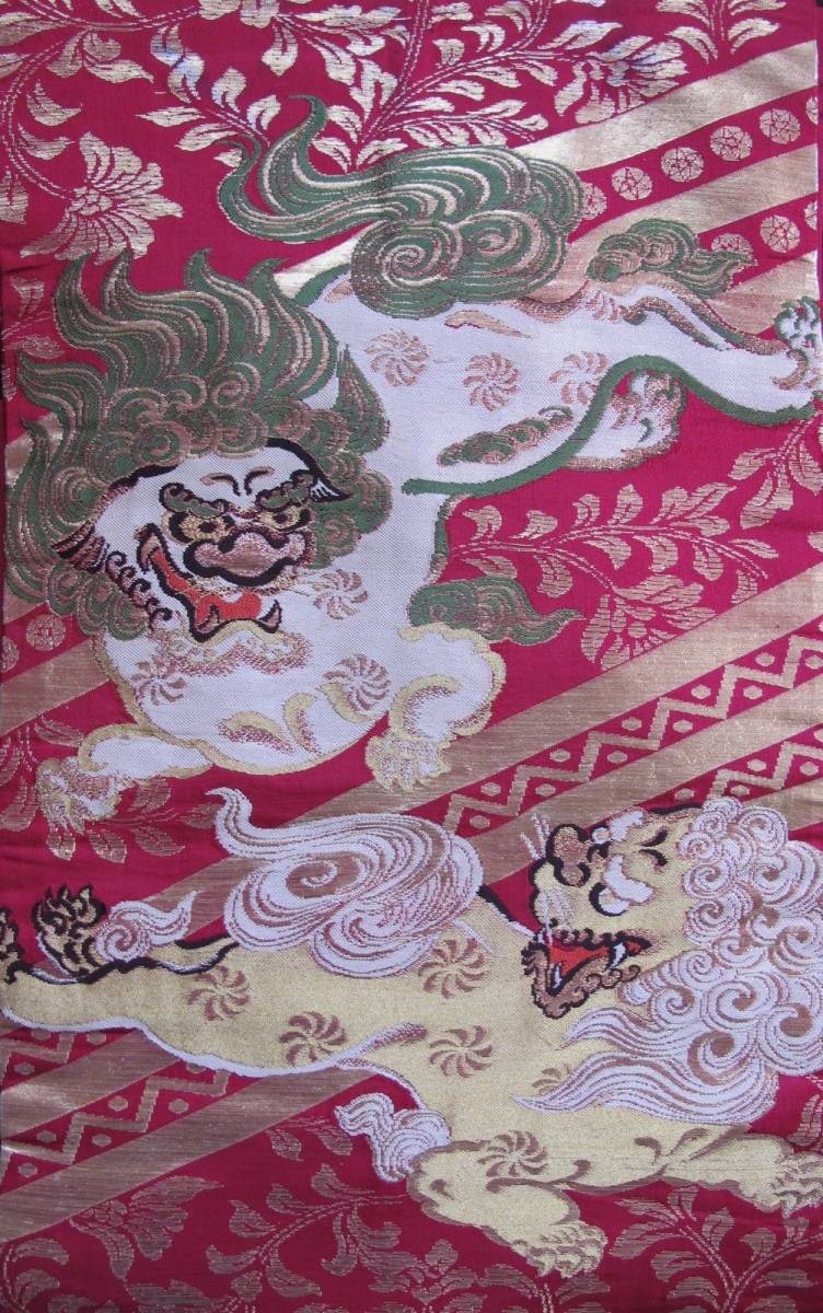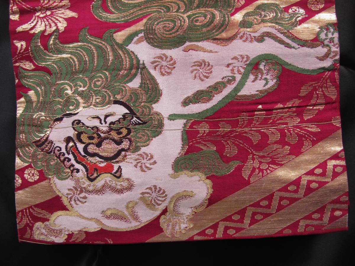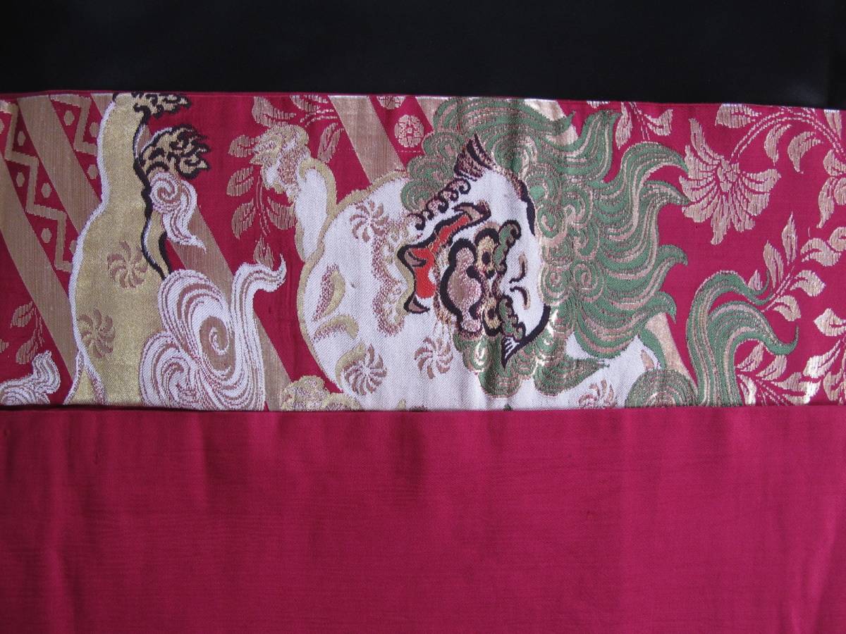 二頭の唐獅子が相まみえる、迫力のあるアンティーク名古屋帯です。 金の唐草模様が気品を添えてくれます。 |
