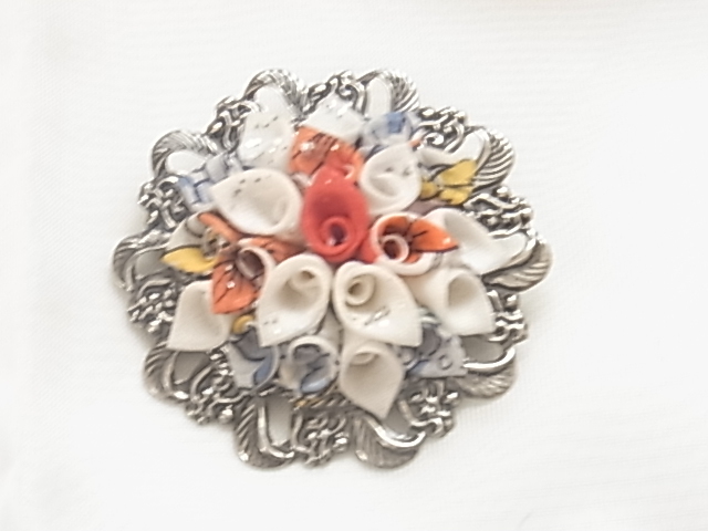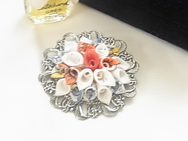 超軽量 直径約4センチ 白を基調に赤やオレンジや水色や黄色がちらほらのお花のデザイン ヴィンテージ ブローチ◎