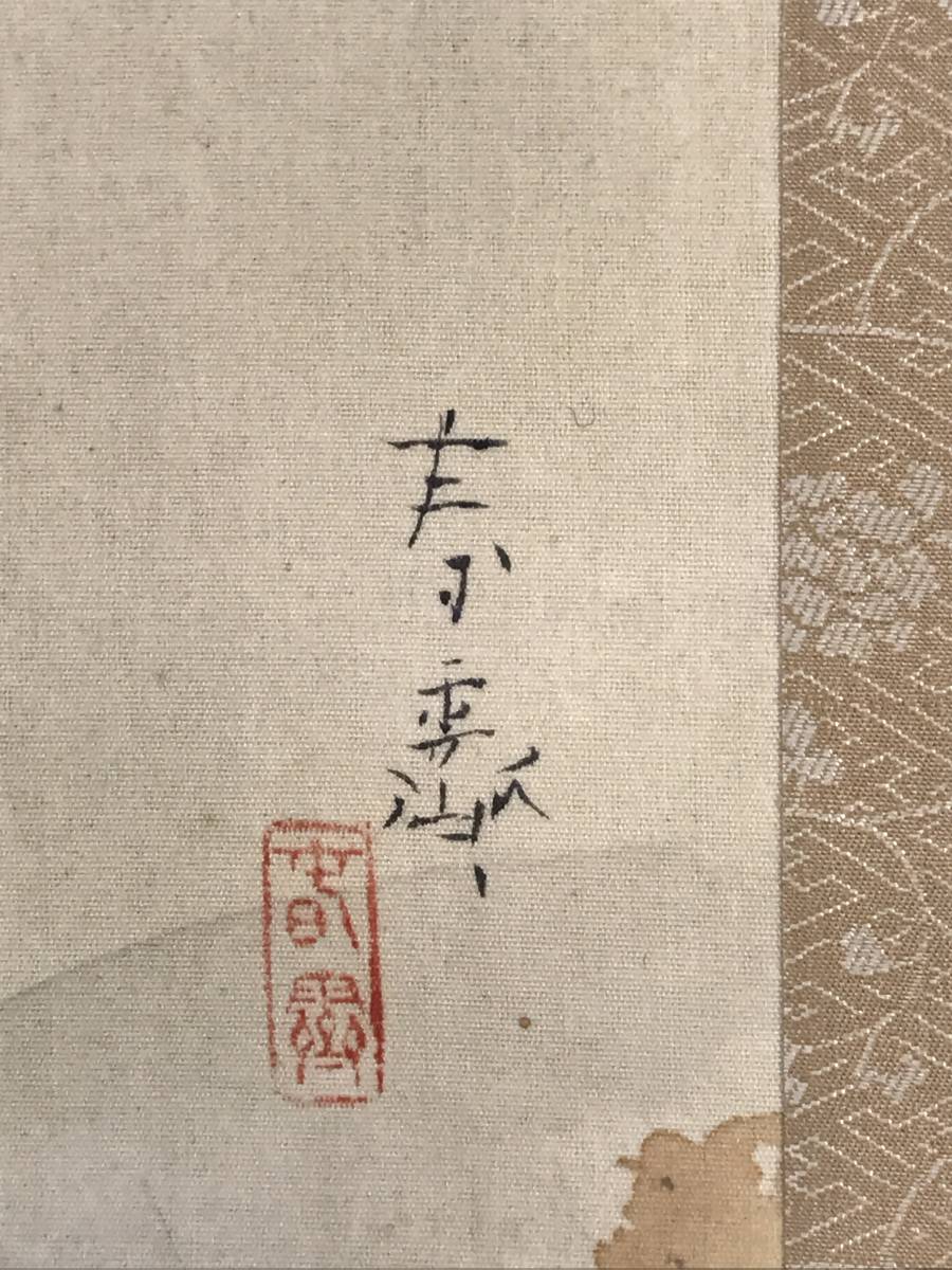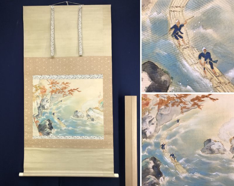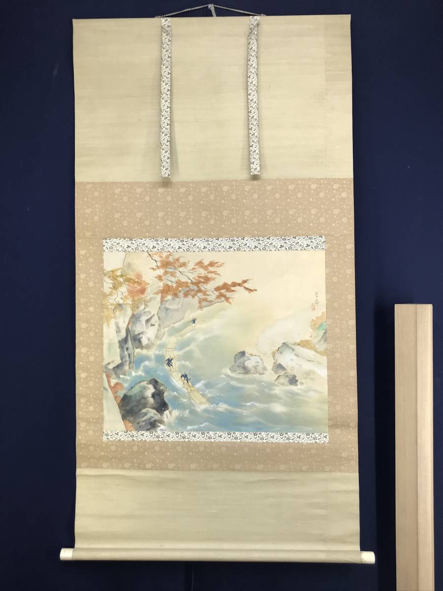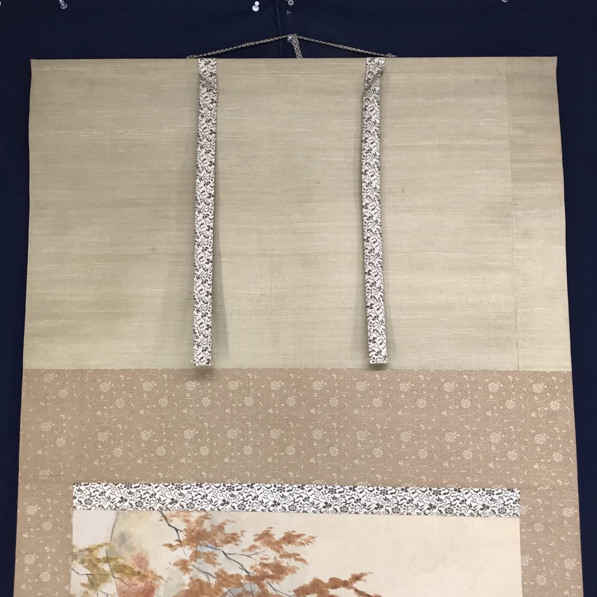 【作品状態】 本紙は絹本肉筆です。本紙は多少の薄汚れあります。表装は概ね良好です。軸先は焼き物で数ヶ所の小キズあります。