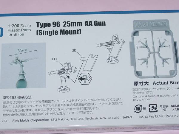 ファインモールド 1/700スケールプラスチックパーツ No.WA21 ナノテク 「九六式25mm 単装機銃」、開始価格で即決いたします。2013年11月発売の再設計・リニューアル版。日本海軍艦艇に使用できる超精密な機銃パーツです。中袋未開封の新品ですが外箱のわずかな擦れ等がありましてもご容赦下さい。完璧な新品状態を望まれる方、神経質な方は入札をご遠慮下さい。発送方法は郵便局の定形外郵便(輸送中の事故補償及び追跡番号無し)または宅配便(ヤマト運輸の宅急便コンパクト・佐川急便・ゆうパック、いずれも全額保証・追跡有り・対面手渡し)からお選びいただき、お知らせ下さい。定形外の送料は落札後にお知らせいたします。定形外に追跡番号が付けられる特定記録郵便は160円プラスとなります。宅配便の送料は自己紹介をご覧下さい。よろしくお願いいたします。