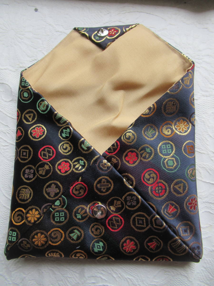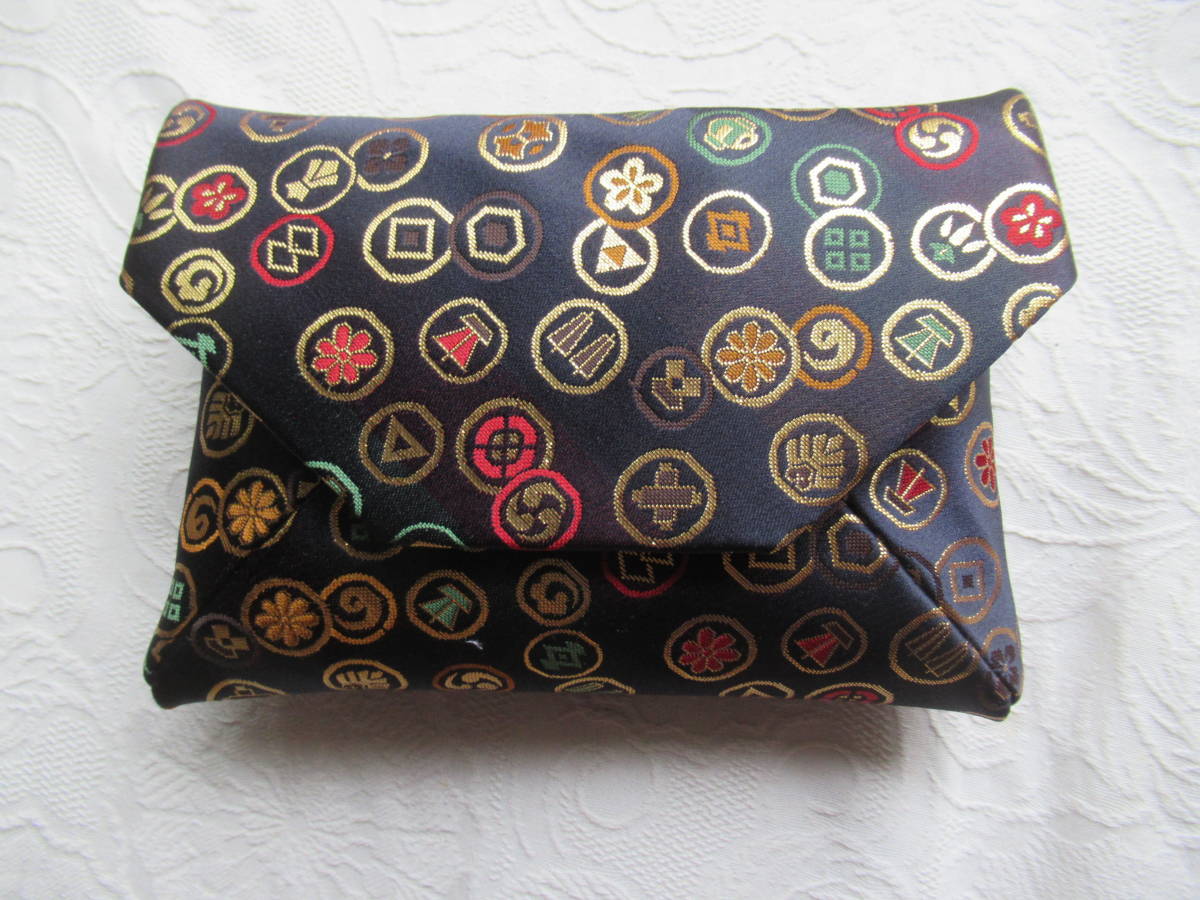 手作り 数寄屋袋 金襴 21x14cm 和風のポーチとしても!黒地家紋風柄 難あり