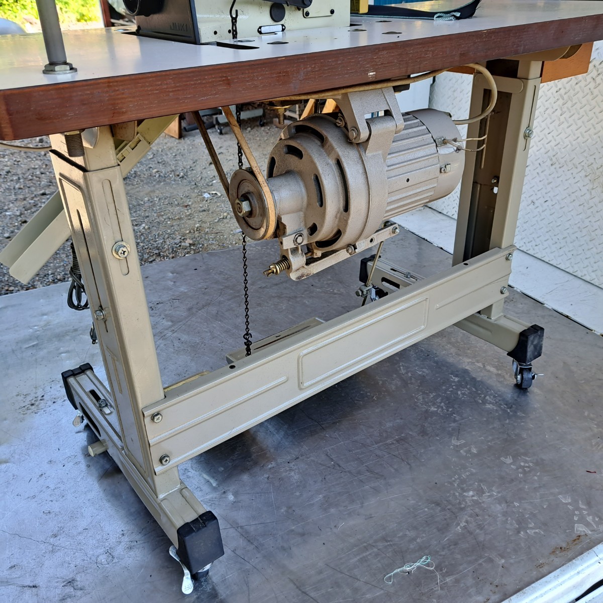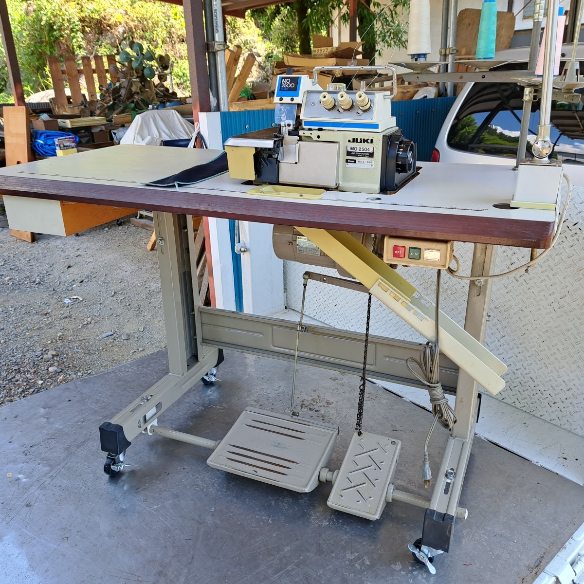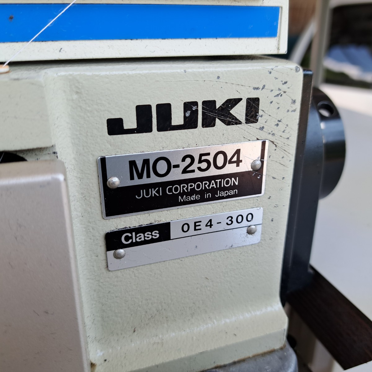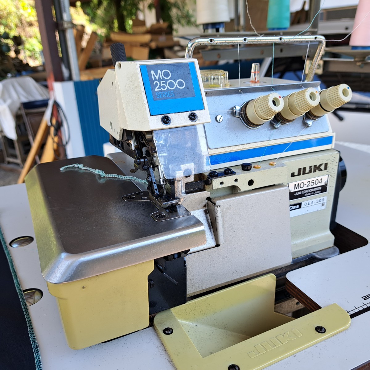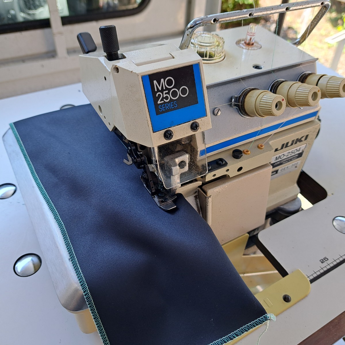 工業用ミシン、ロックミシン、ジューキ、JUKIオーバーロックミシンMO-2504(3本糸1本針)!整備済品、作動良好、電源100ボルト!で御座います。