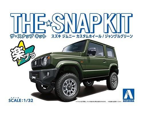 アオシマ社製ザ・スナップキットシリーズよりスズキ ジムニー カスタムホイール(ジャングルグリーン) 1/32スケールです。塗装、接着剤不要の簡単プラモデル。スケールモデル入門にいかがでしょうか。シリーズ初、リフトアップ機構搭載!大迫力ジムニー!大人気のジムニーにシリーズ初のリフトアップ機構を追加、インチアップのブロックタイヤとカスタムホイールで迫力の仕上がり。ホイールのリムとディスク面は別パーツになっているので、同時発売の別カラーとの組換えでオリジナルカラーホイールを製作可能。パーツ点数35点のお手軽モデル選択式でリフトアップ仕様も組み立て可能インチアップブロックタイヤ(新金型)カスタムホイール(新金型)■塗装不要ボディ色をプラスチック材料の着色で再現する事により、塗装不要となりました。ツヤツヤのボディも見どころです。■接着剤不要はめ込み式を採用する事で接着剤が不要となりました。■お手頃価格キットの簡略化と1/32スケールとする事でお手頃価格を実現しました。【製品仕様】・ボディカラー:ジャングルグリーン・ホイールカラー:メッキ※カスタムホイール仕様のため、ノーマルタイヤ・ホイールは付属しておりません。※車種によりホイールカラーが異なりますのでご注意ください。