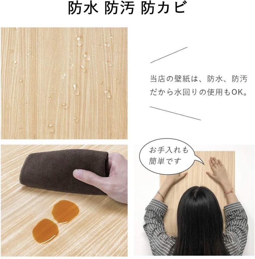 ・素材:壁紙シールはPVC(ポリ塩化ビニル)を採用し耐熱性と耐油性が良いです。表面は平らで木目方向に少しエンボス加工が施されていると同時に、滑らかさを維持しています。防水加工も施されており、家具や壁を湿気から守ることができます。汚れも付きにくく、お手入れはサッと水拭きするだけでOK。丈夫な素材で破れにくい壁紙シールです。