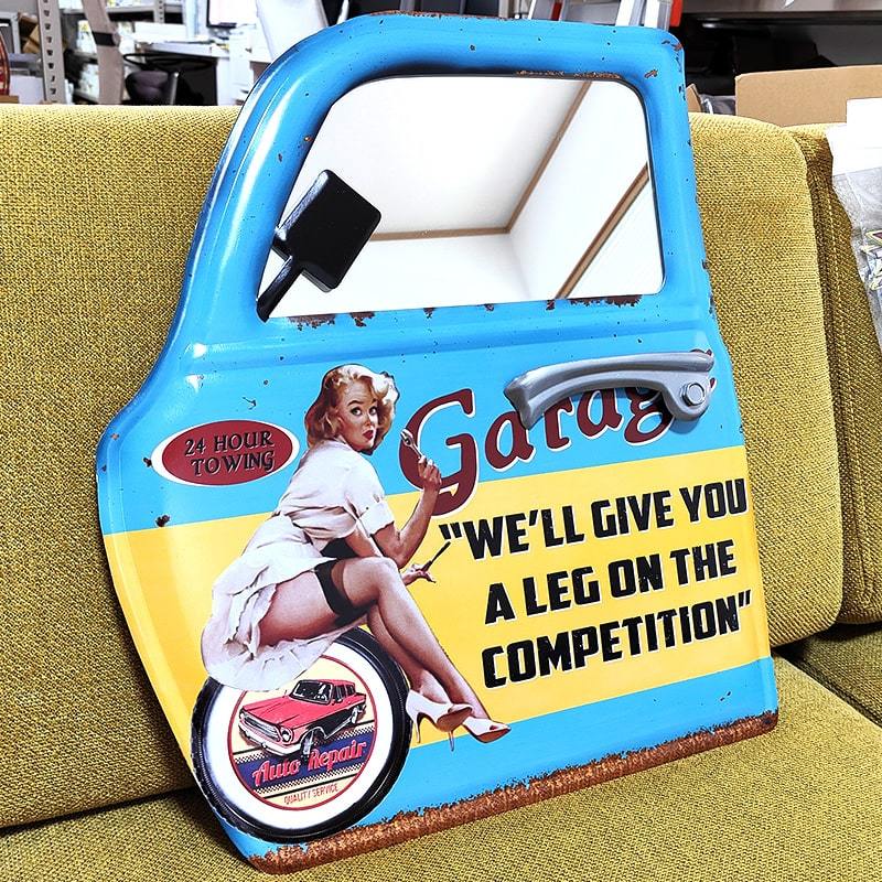 | 商品説明 | 【カー ドアミラー看板 GARAGE Girl】 車のドアを外してきたようなデザインで、インパクトの大のウォールミラーです。 錆びているように見えるビンテージ加工が、レトロ感のある仕上がり。 取っ手の部分も立体的になっており、車のドアが細かく再現されています! 裏面には壁掛け用フックがついており、簡単に飾ることができます。 壁に取り付けなくても、机の上等に立てかけておくだけでオシャレです。 お店やお部屋のアクセントに是非にいかがでしょうか? |
