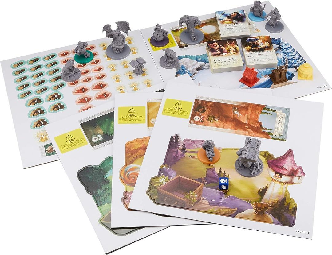 採集ボード:4枚、プレイヤーボード:4枚、採集カード:16枚、早見表カード:4枚、寓話カード:58枚、おともだちカード:25枚、資材トークン(小):50個、資材トークン(大):15個、