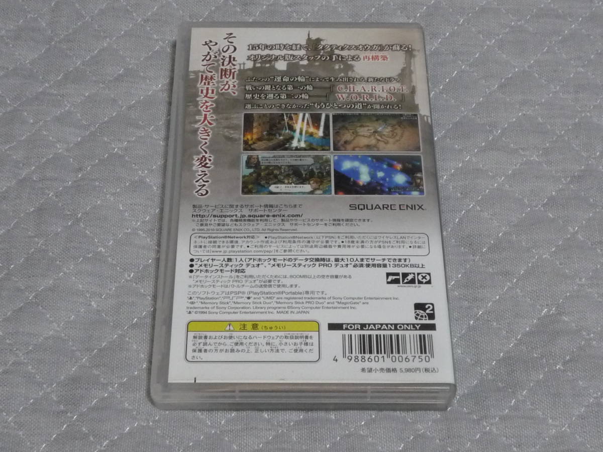 TACTICS OGRE。SQUARE ENIX。CERO B(12才以上推奨)。UMD。1人用、メモリースティックの使用容量1350KB以上。アドホックモード対応(データ交換時は最大10人までサーチ可能)。商品数:1個。