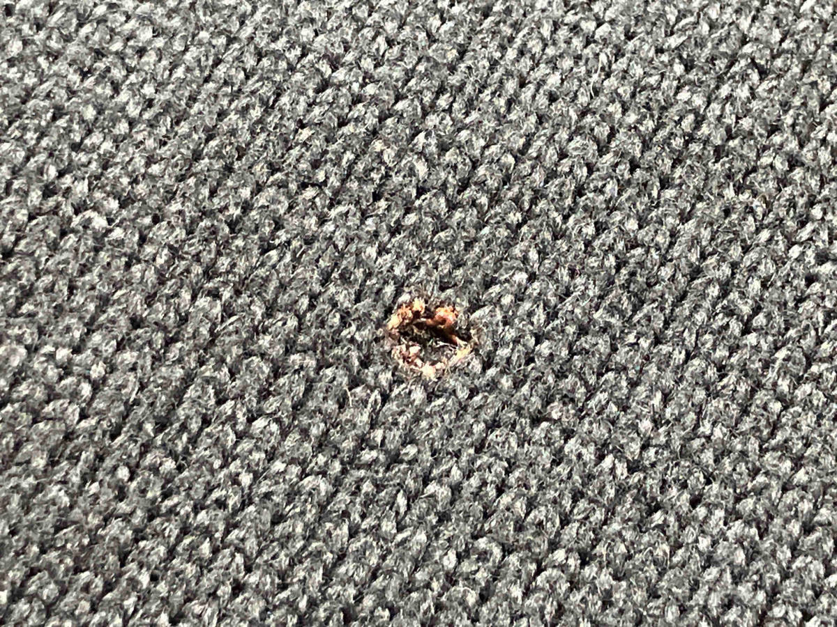 | 汚れやスレ、毛玉の付着があります。 右下部分に焦げたような穴があります。 画像にあるものが全てです。 |