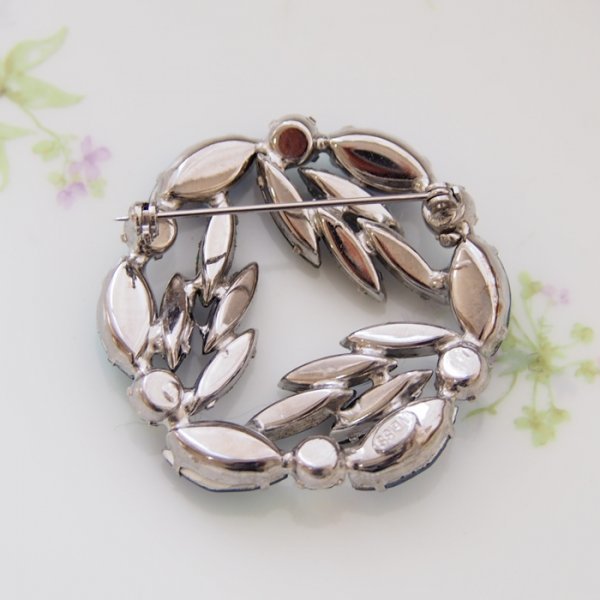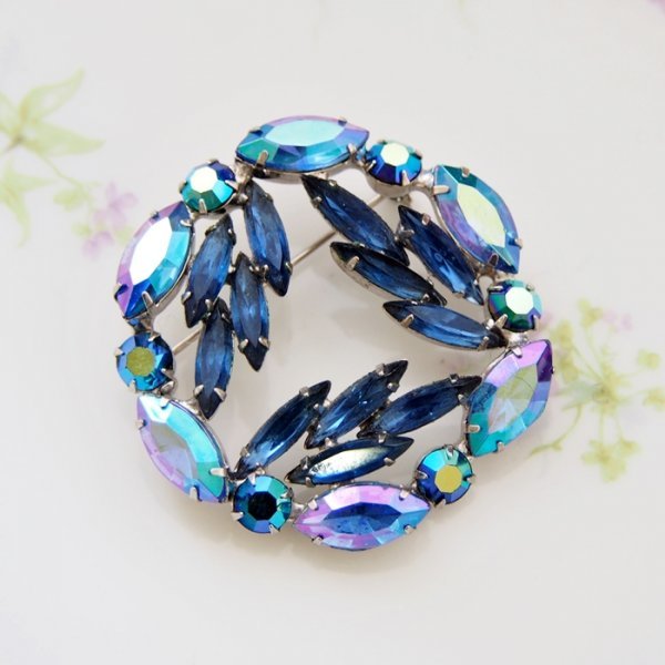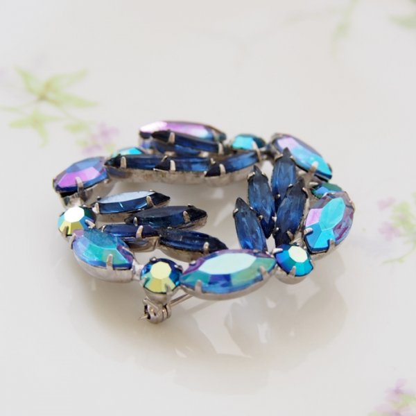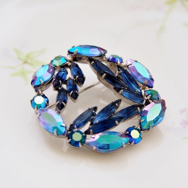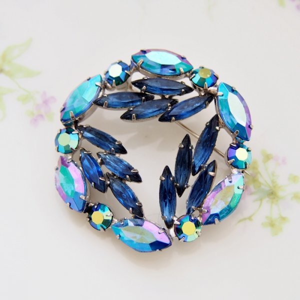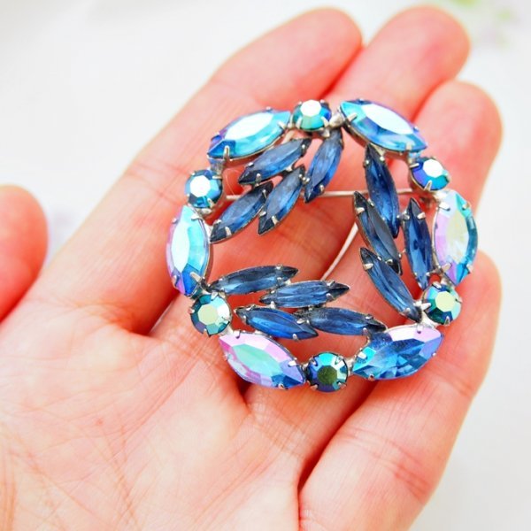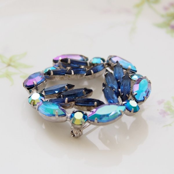 ブルー&オーロララインストーンのブローチです。 ブルー系のオーロララインストーンがきらめき、とても綺麗に輝いています。 落ち着いたブルーの色合いで、秋・冬のコーディネートにもぴったりな雰囲気。 コートやストールのアクセントに活躍してくれそうです。 お洋服以外にも帽子や鞄のアクセントにもどうぞ。 経年の為、ラインストーンに多少のかげりが見られます。 ■ブランド: WEISS ■刻印: WEISS ■年代(推定): 1950-60年代頃 ■輸入国: アメリカ ■サイズ: 約4.8cm x 約4.8cm ■重量: 約15g アンティーク・ヴィンテージ商品には、経年による傷や劣化などがあります。 目立つものはアイテムの詳細に記載しておりますが、説明以外にもキズや損傷などがある場合がございます。 古いものですので、ご理解いただける方のみご入札下さいませ。 他サイトでも販売しておりますので、同時にご注文があった場合は、品切れの場合もあります。その場合は、大変申し訳ございませんが、ご注文をキャンセルとさせて頂きます事をご了承くださいます様お願いいたします。 | |||