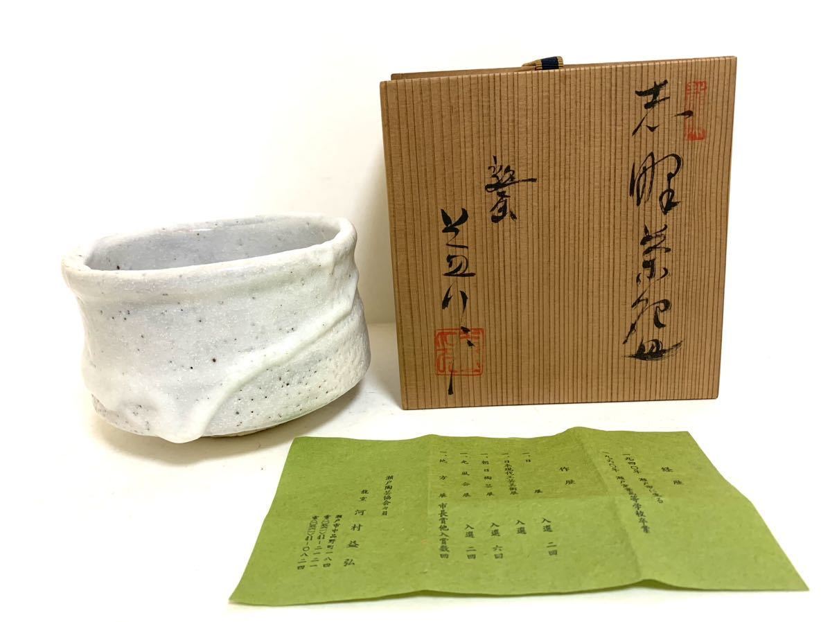 河村益弘 志野焼抹茶碗の出品になります。状態は、割れなど大きなダメージはございませんが、箱は経年によるヤケ汚れキズがございます。
