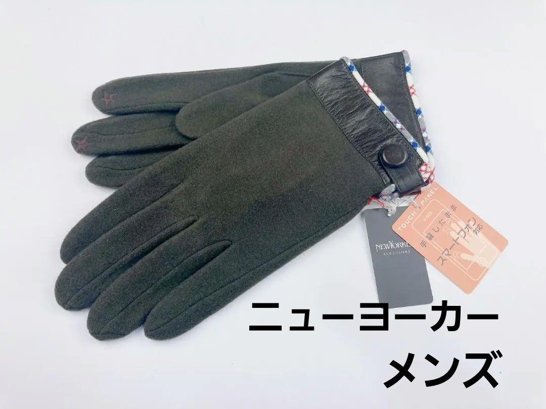 ●ニューヨーカーNEWYOKERのスマホ対応メンズ手袋、新品です。色は茶。素材は本体:アクリル、指定外繊維(テンセル)。裾部:綿100%。ベルト部:羊革。正規ライセンス販売品です。 表記寸法は23-24㎝。実寸で手首から中指の先まで約24.5㎝。