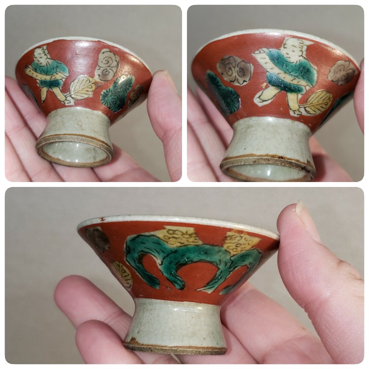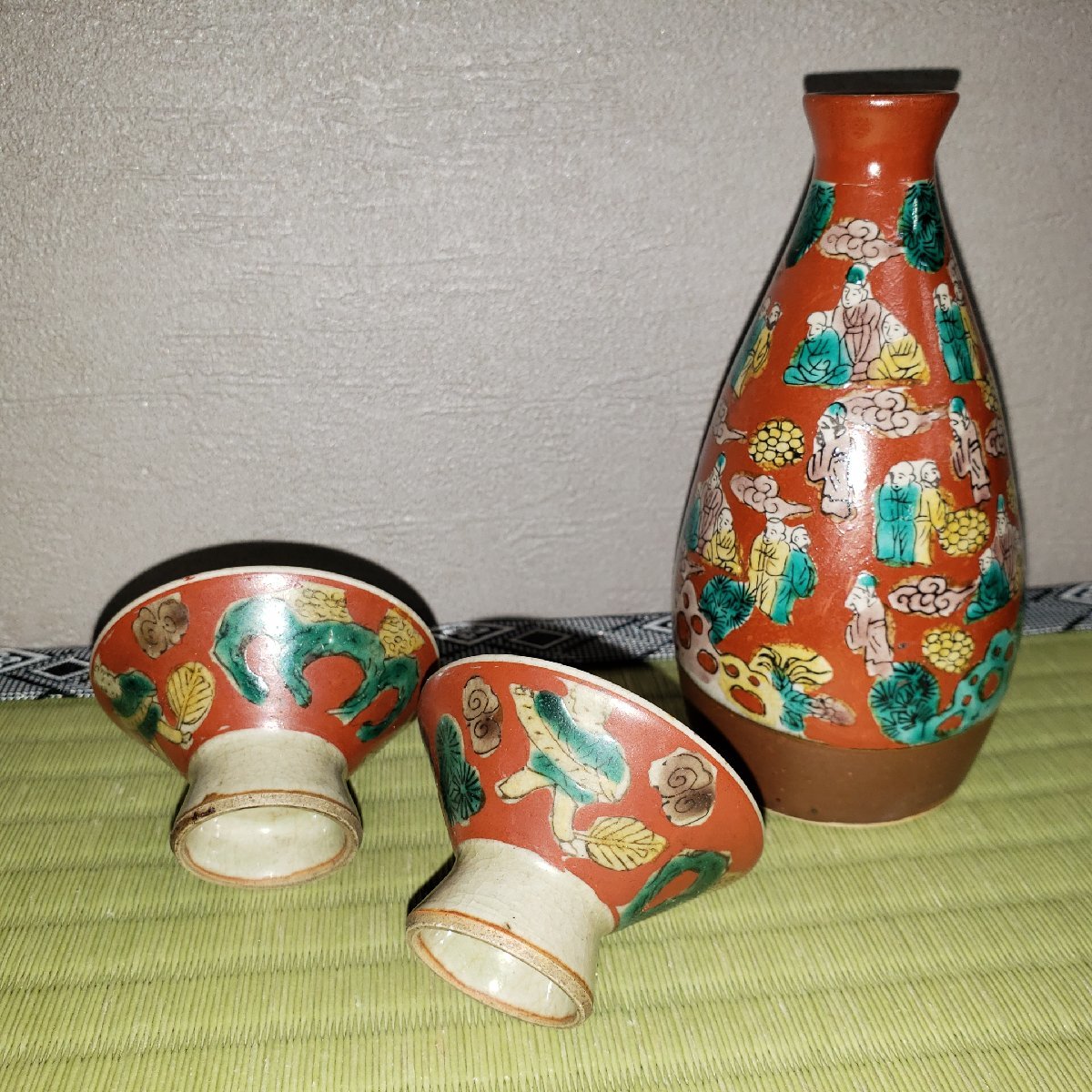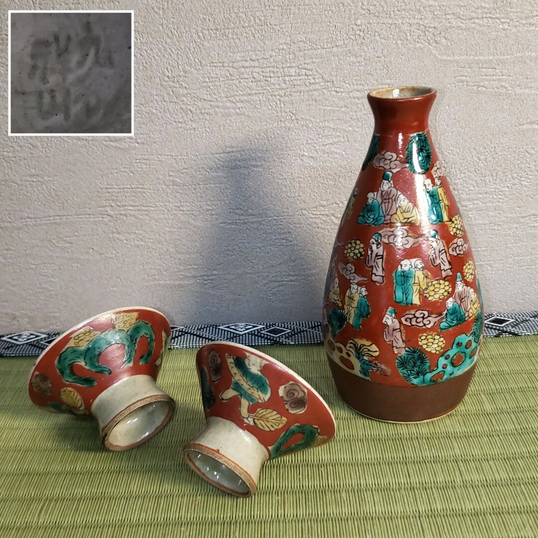 古い九谷祥山作の酒器です。徳利1客と猪口2客のセットです。外箱はありません。経年による汚れ、擦れがあります。徳利の中は大まかに洗いましたが汚れが残っているかもしれません。