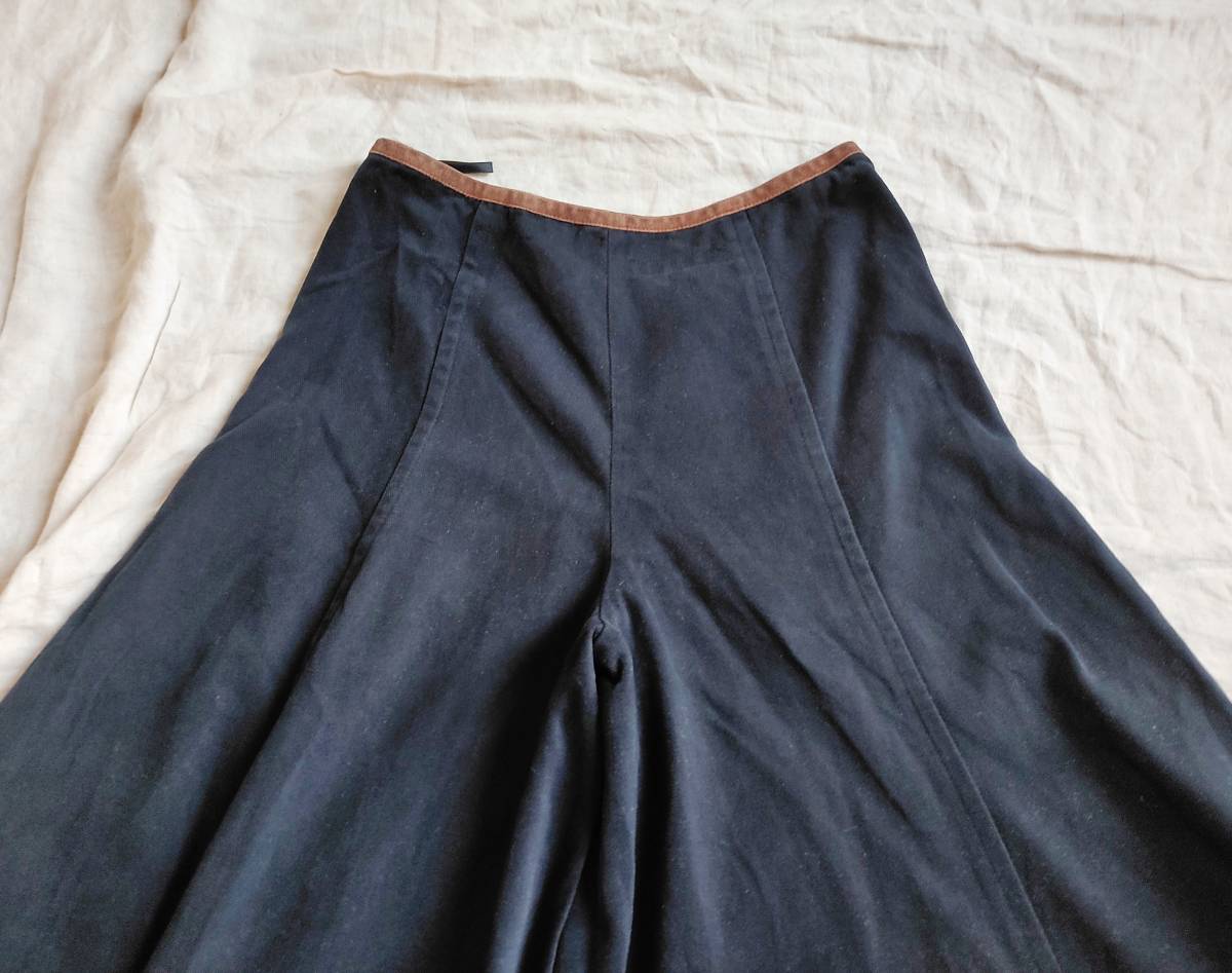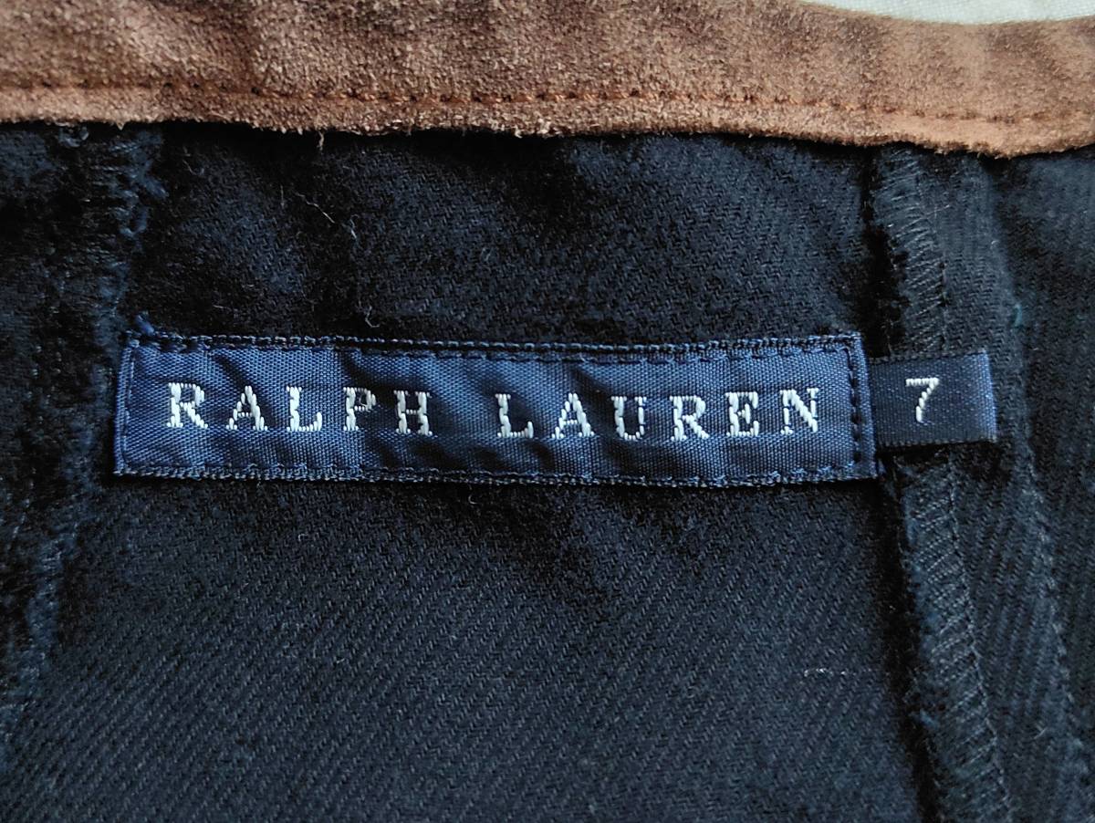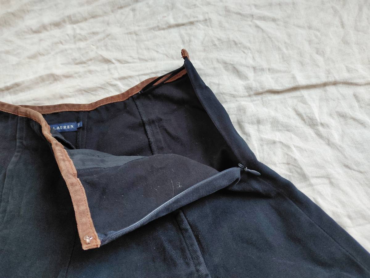 90’S ビンテージ RALPH LAUREN ラルフローレン パンツ ワイド フレア ブーツカット チノツイル コットン レザー切替 紺 7 レディース ★11