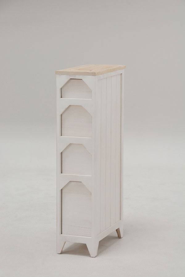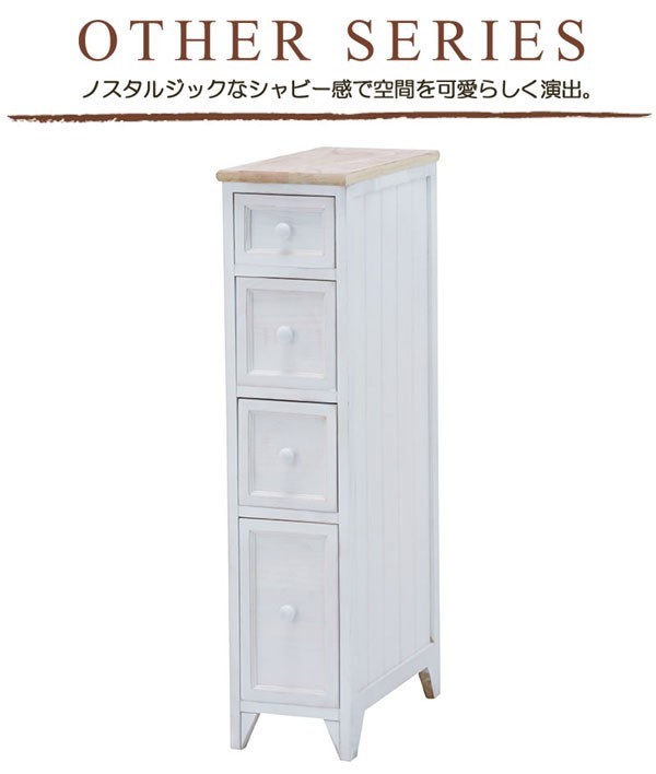 シャビーテイスト木製スリムチェスト 20幅4段 ホワイト色(白色) 完成品天板はナチュラル色、ボディはホワイトの使い込んだ風合い(シャビーテイスト)のアンティーク風スリムチェストです。同色の木製取っ手つまみがおしゃれです。スリムタイプで隙間に置けるお洒落なチェストです。届いてすぐに使えるうれしい完成品(取っ手のみ取付式)◆サイズ:(約)幅20×奥行40×高さ85センチ◆主材:桐材※こちらの商品はご注文いただいてから1日~2日(土日除く)での発送となります◇このシリーズには「20幅4段85センチ高」「25幅4段85センチ高」「31幅6段71.5センチ高」「31幅8段95センチ高」の4タイプがございます。☆落札、ご入金確認後 1~2日にて発送いたします 追加納期のかかるものは商品ページに記載いたしております よろしくお願いいたします。