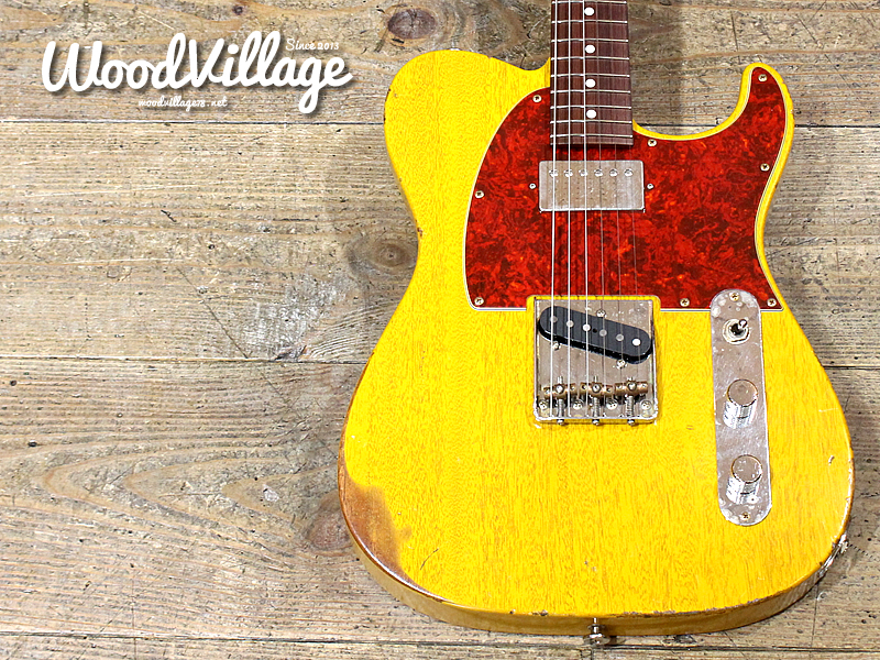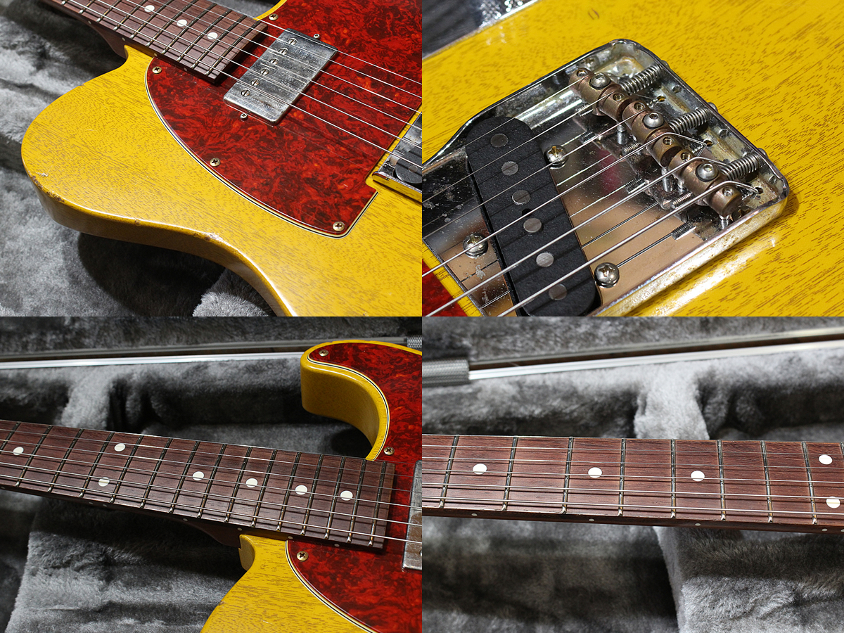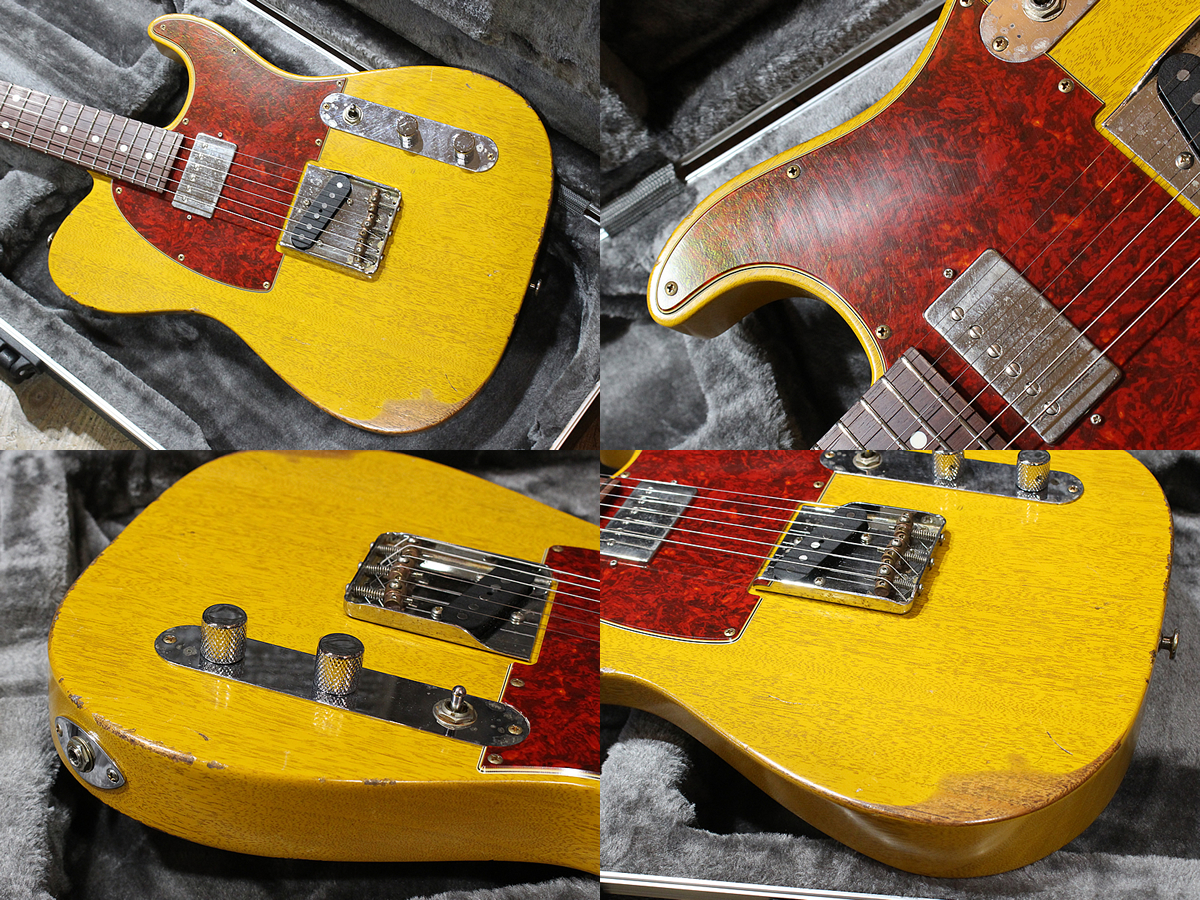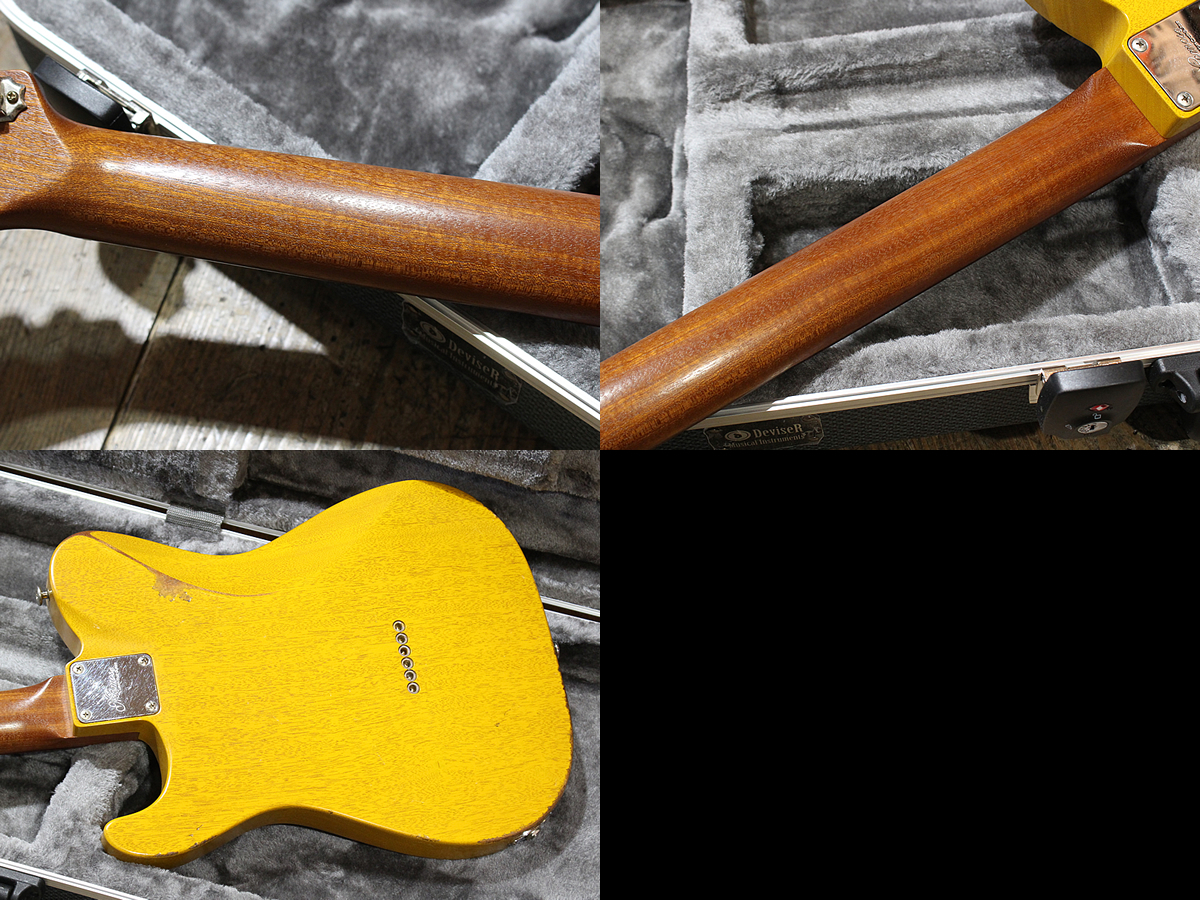 2019年春ディバイザースペシャルモデルの内の1本。フロントにハムバッカーを搭載したテレキャスタータイプです。ボディ、ネック、ともにマホガニーが採用され、指板にはマダガスカルローズウッド、という豪華でレアなチョイスがなされております。塗装はオイルフィニッシュ、全体的にレリック加工が施され、激シブな仕上がりに。金属パーツもエイジドされ、貫禄のある佇まいでございます。Mシェイプのオリジナルヘッドはボディと同色に塗装され、マッチングヘッドに。ボディはバックコンターや、ジョイント部の微かなテーパーなど、かっこいいだけでなく演奏性の向上も視野に入っております。指板ラジアスは210mmR(8.27"R)というヴィンテージスタイルよりかは少し平たい、モモセ特有のラジアスです。他ではVanzandtなどもそうですね。スケールはロングです。ピックアップはオリジナルを搭載。いずれも非常にクオリティの高いトーンをしており、本体の乾いた響きと良い具合にマッチしているように思います。国産らしい精度の高い、澄んだ響きをしつつも、生々しいダイレクトなサウンドが魅力的で、弾き手のニュアンスを丁寧に汲み取ってくれる優秀な楽器でございます。