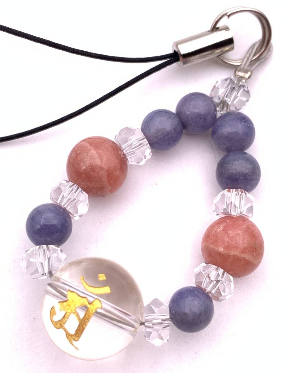 天然石水晶守護仏梵字金彫り12mm玉&タンザナイト&インカローズ(ロードクロサイト)のストラップ
