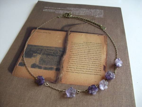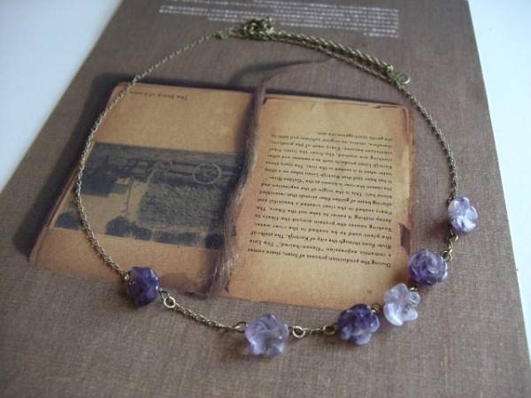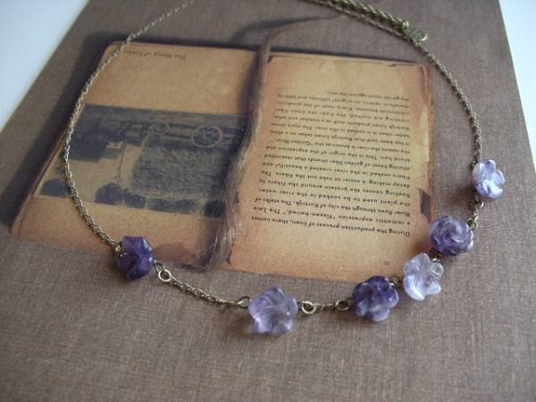 可愛さのスパイス・・シリーズです♪アメジスト・マニア・・神秘的なアメジストのネックレスです♪繊細なパープルのグラデーションのお色のお花や薔薇を集めて可憐な表情です♪華奢なチェーンには12~13ミリ位のアメジストのお花や薔薇を散らしてロマンチックしています♪長さは55センチ+アジャスター10センチで最長65センチ位です♪お揃いのネックレスやブレスレットも出品しています♪シンプルで飽きのこないいつまでも着けられるデザインを考えて作りました!ハンドメイドをご理解頂いてノークレーム、ノーリターンでお願いします