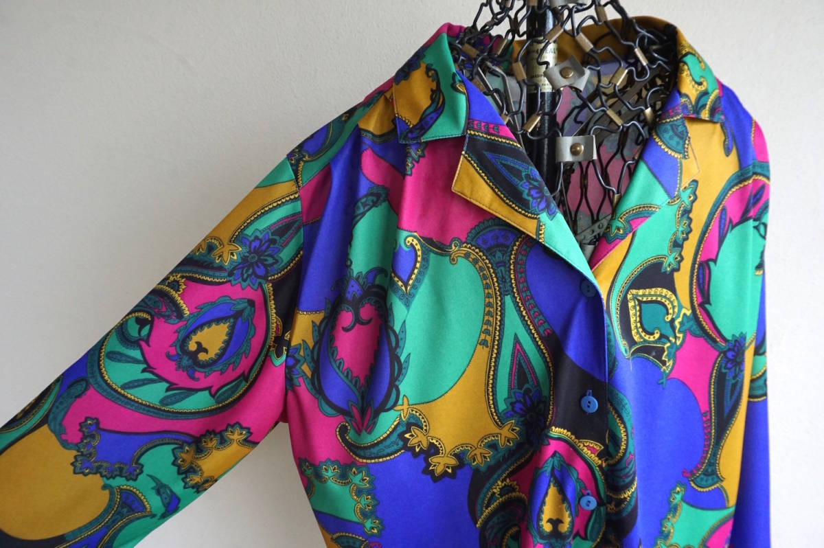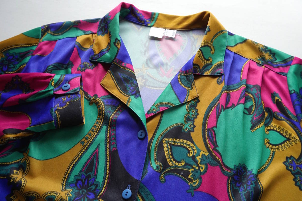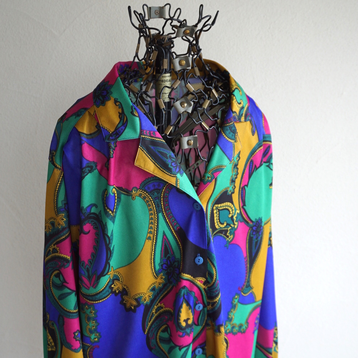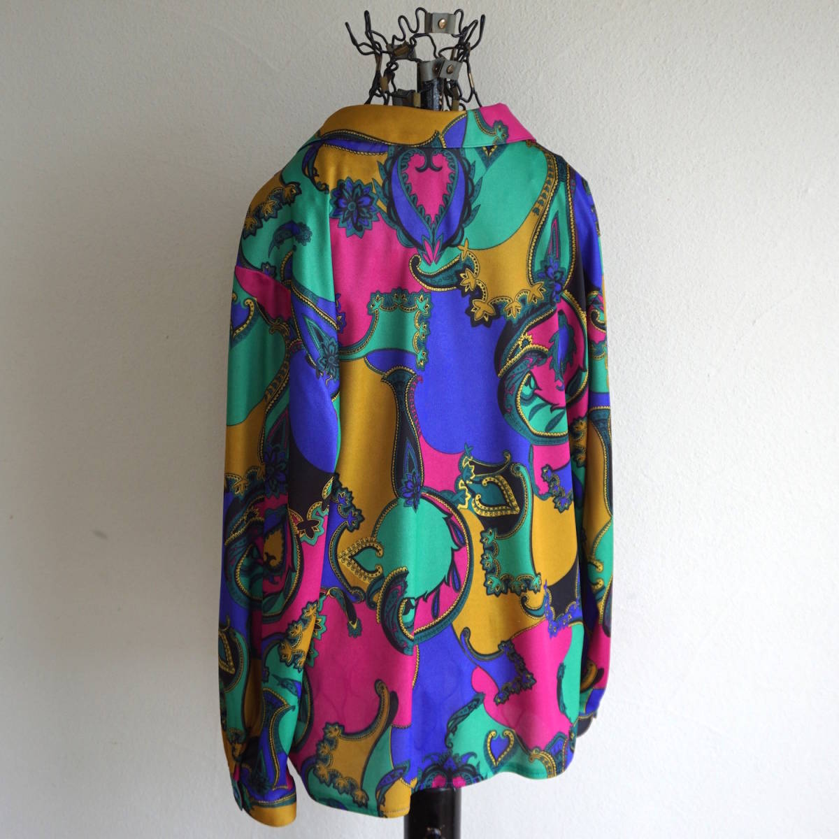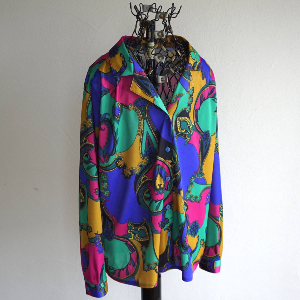 1980s ヴィンテージ ユーロ 原色系バロックプリント オープンカラー ポリエステルシャツブラウス 42 L〜XL位 総柄 ヨーロッパ 海外 古着