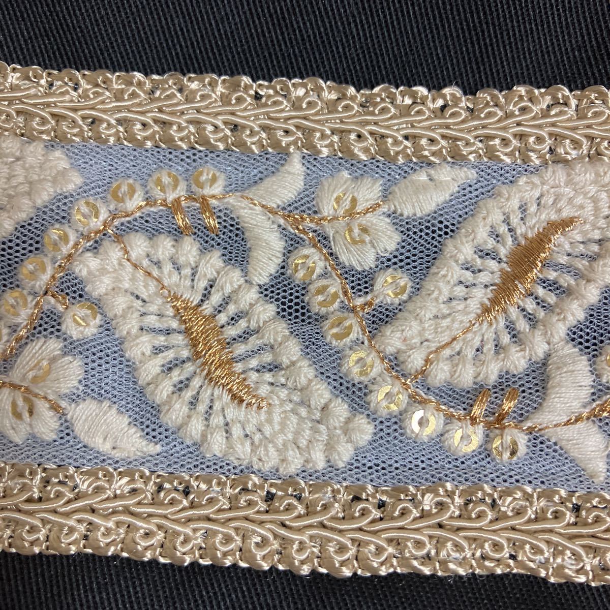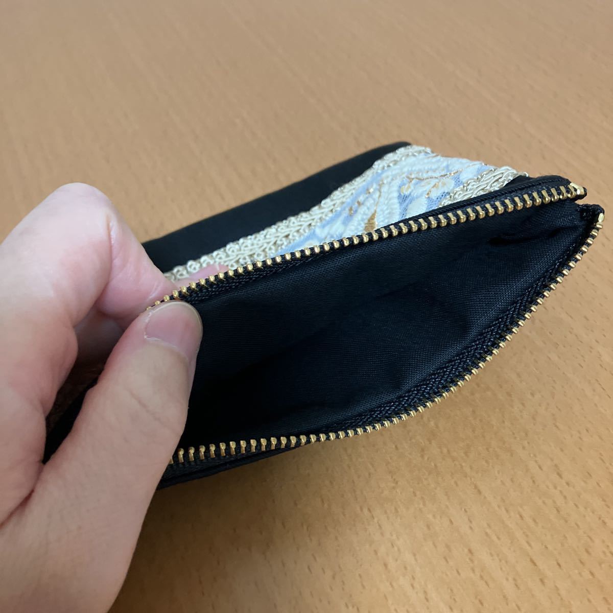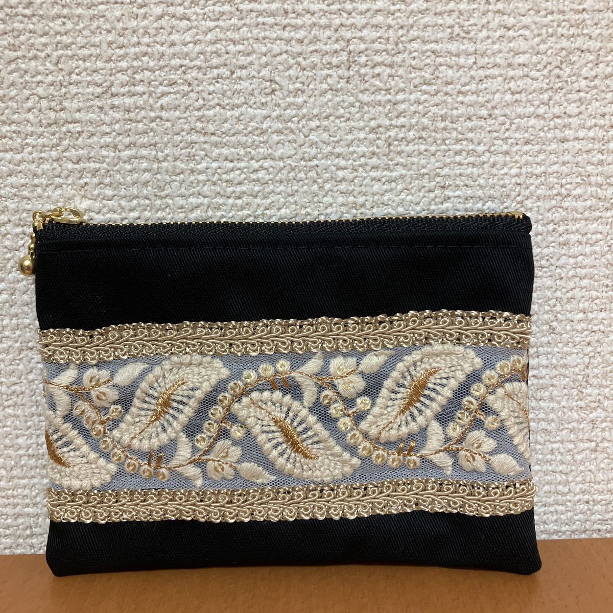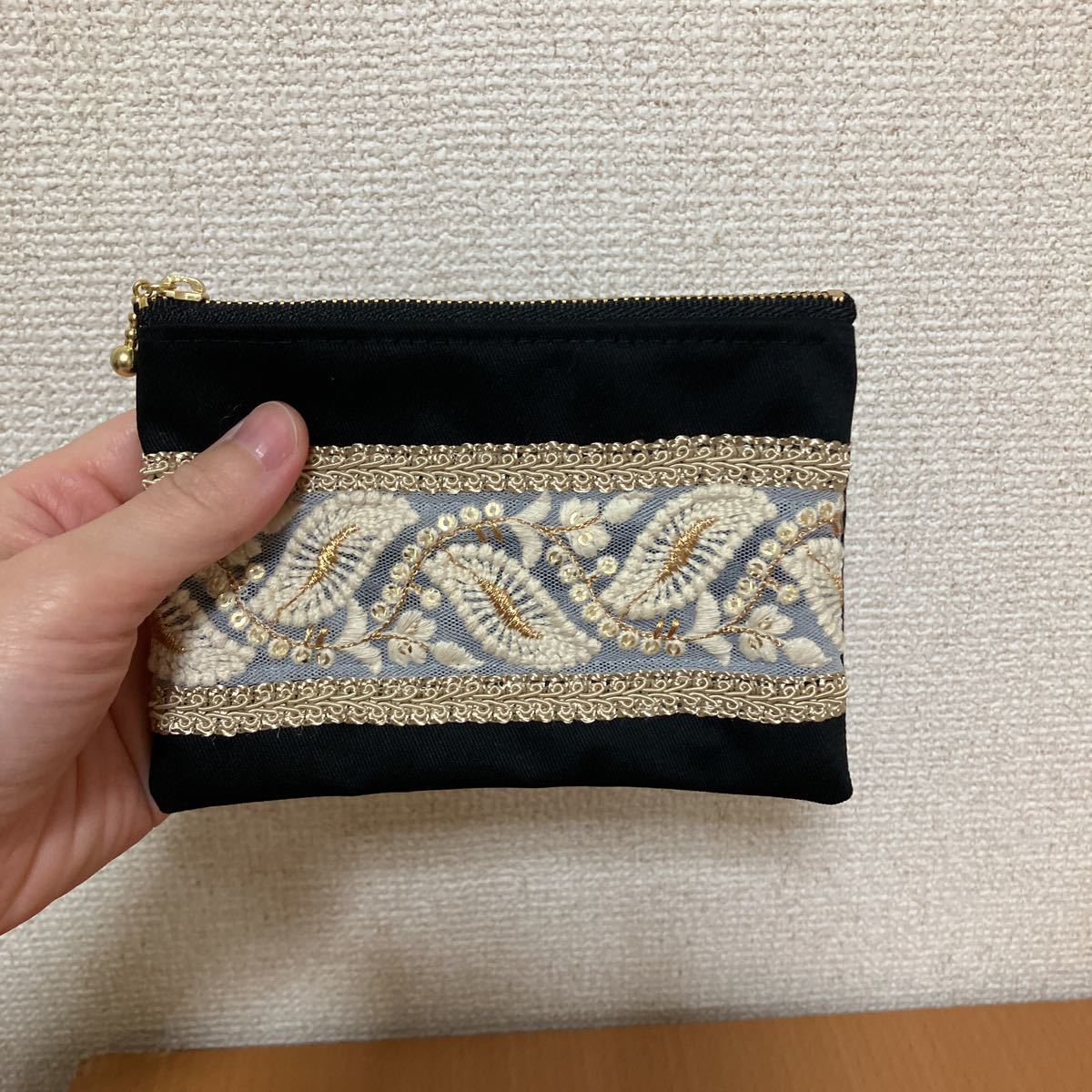 14センチのファスナーを使用し、片面にインド刺繍リボンを付けてポーチを作りました。接着芯は貼っておりませんが、表布は少しハリのあるツイル生地で仕上げています。内布あります。小物入れなどにいかがでしょうか。インド刺繍リボンは繊細な作りのため、スパンコールが付いている物は引っかかったり糸が出たりほつれたりする可能性があります。ご了承下さい。