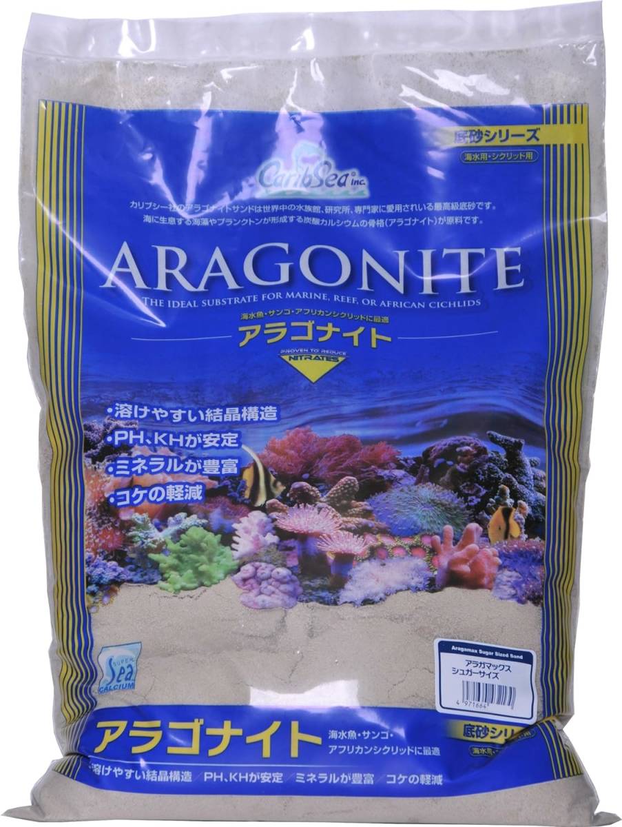 ●アラゴナイトは太古の昔の生物(貝や海藻など)の化石です。カリブシー社のアラゴナイトはやわらかい結晶構造で溶解性が高いため、底砂として使用することによってろ過バクテリアの棲み処となるだけでなく、サンゴや魚の生育に必要な微量元素とミネラルを安定供給することができます。 また、カリブシー社製アラゴナイトサンドはコケや水質悪化の原因となる有機物、リン、窒素の含有量が低いのが特長です。