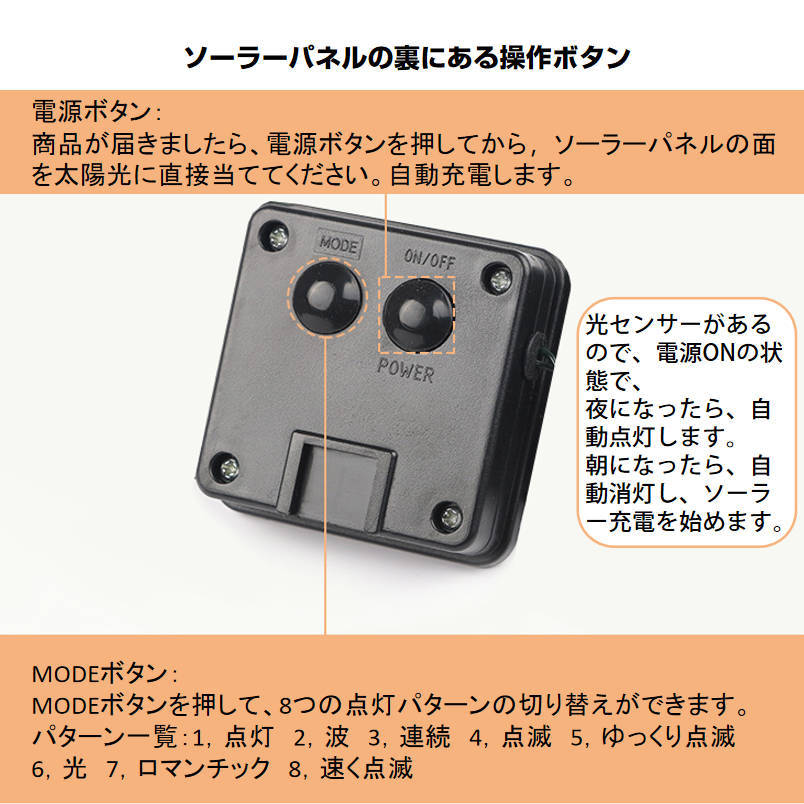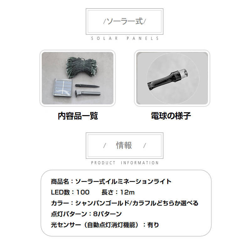 | 商品内容物:本体 (ソーラーパネル付きコントローラー と LEDイルミネーションライト)×1、ソーラーパネル用スタンド×1サイズ:ソーラーパネル:W6.6×H6.8×D2.2cm、支柱:22cmライトの色:シャンパンゴールド、カラフル どちらか選べる電球数:100球電球間隔:10cmコード長さ:12M入力電圧:AC100V 50/60Hz点灯パターン:8種類材質:PVC+銅線防水加工:防水・防滴型照度感知機能:あり、環境照度が低くなった時は自動点灯し、周囲が明るくなったら、自動消灯します。点灯パターン:8種類ご確認:モニター発色によって、商品の色や質感など、画像と実物は、多少異なる場合がございます。雨が連日続く場合、電源ボタンを押して、電源をOFFにしておいたほうがバッテリーの寿命が長く伸びます。 |
