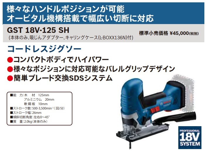 BOSCH ボッシュコードレスジグソーGST18V-125SH(本体のみ、吸じんアダプター、キャリングケース(L-BOXX136N)付)■特長・コンパクトボディでハイパワー・様々なポジションに対応可能なバレルグリップデザイン・簡単ブレード交換SDSシステム■仕様・能力:木材125mm/アルミニウム20mm/軟鋼板10mm・ストローク数:500-3,500min-1(回/分) ・ストローク幅:26mm・傾斜切断角度:左右0~45°・質量:2.0kg(本体のみ)