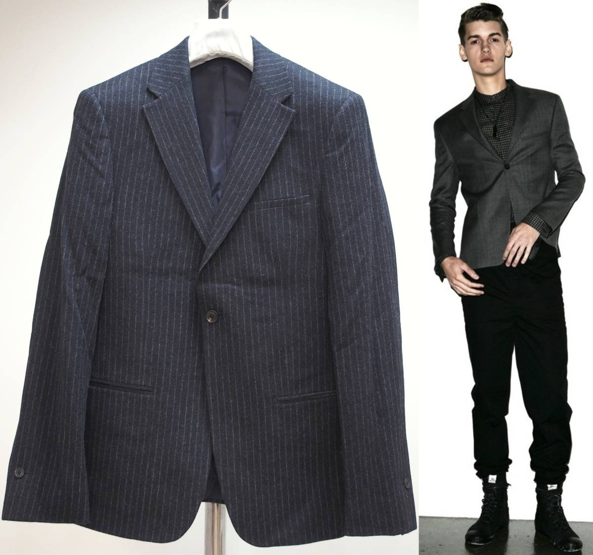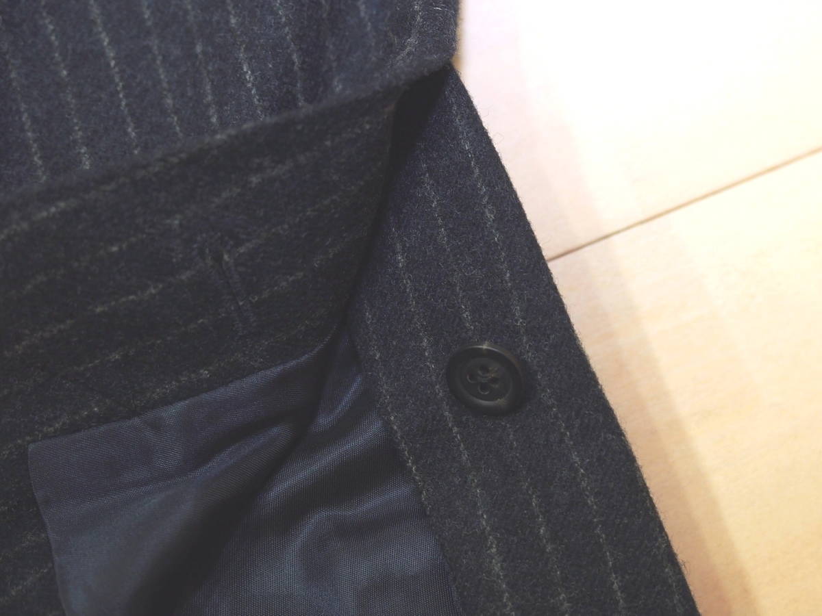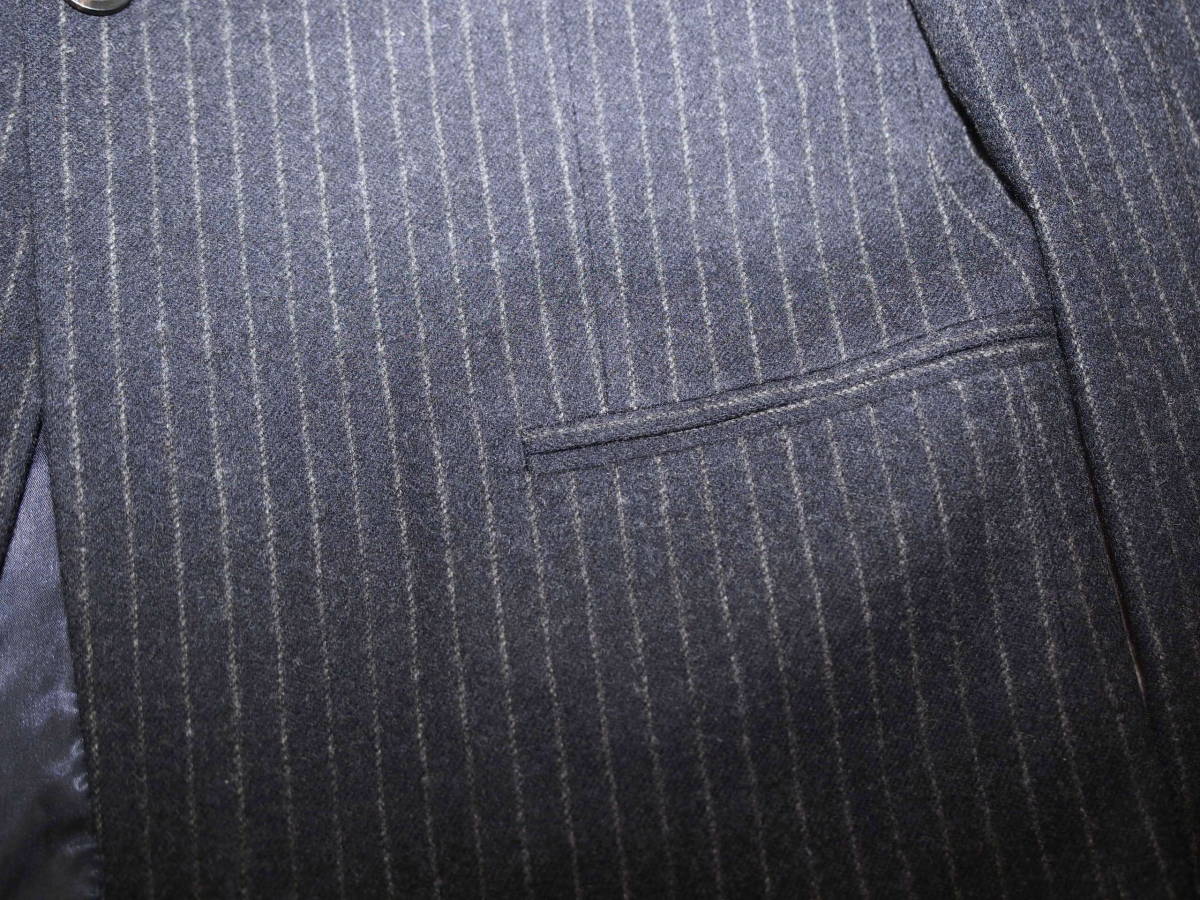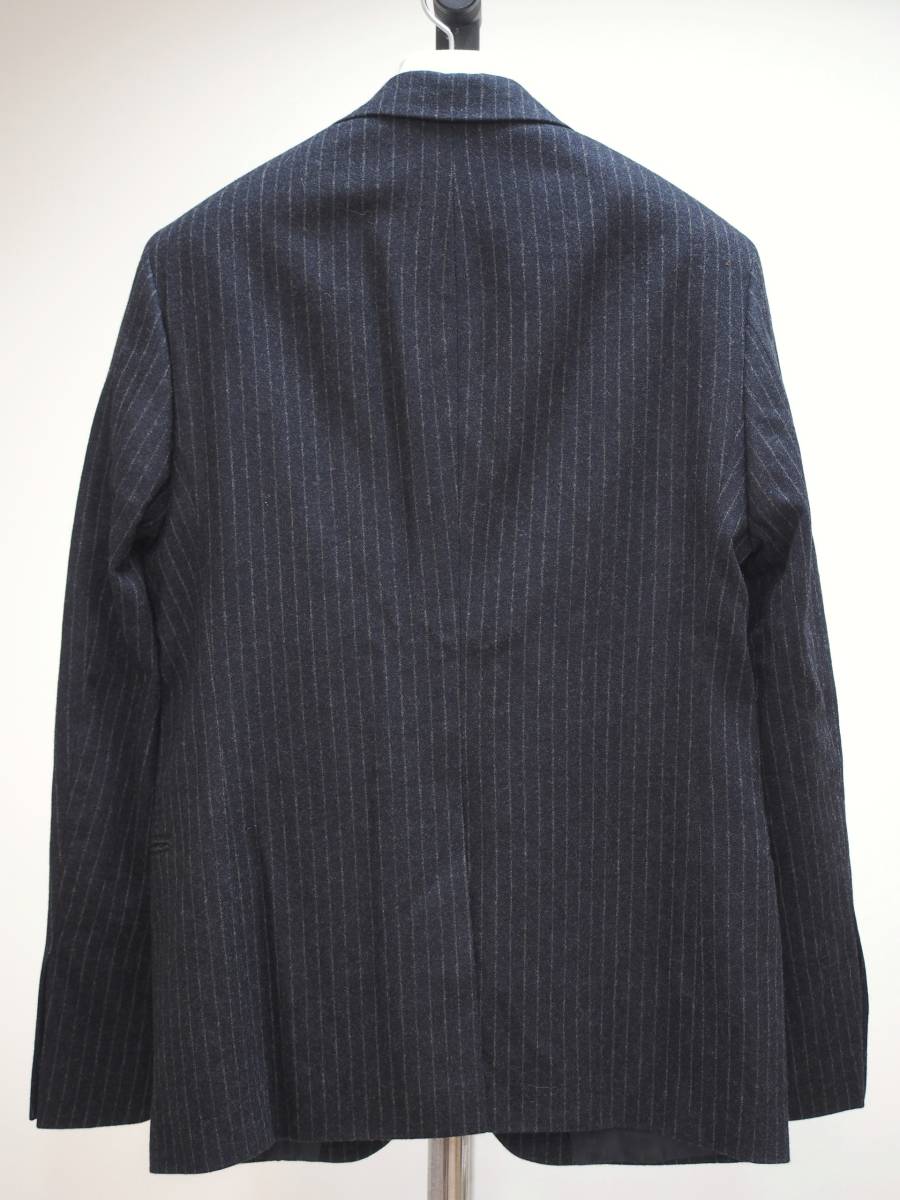 ストライプの入ったフランネルウール地の秋冬のジャケットです。ボタン位置高めのノッチドワイドラペルで、細身のきれいなシルエットです。